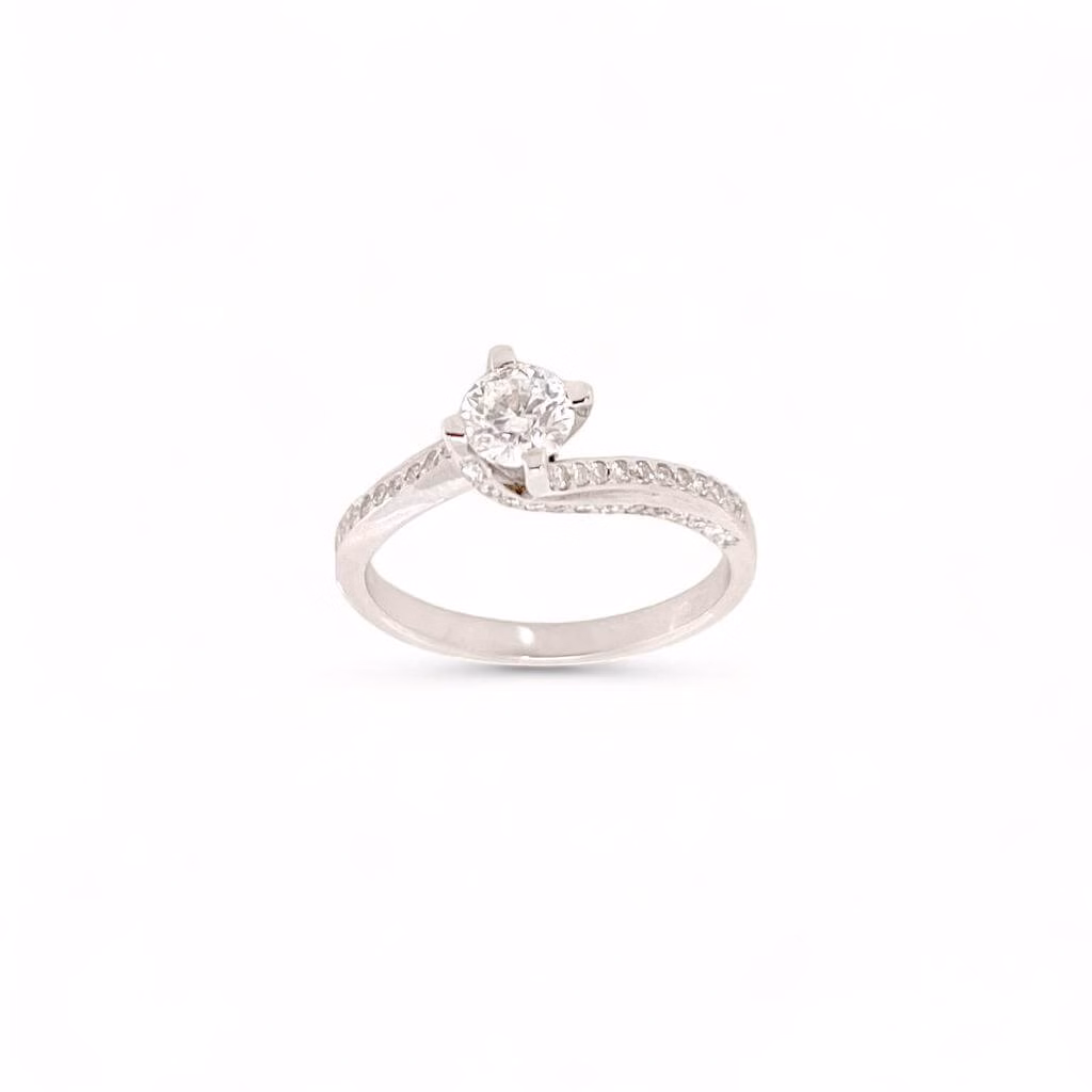 Cipolla diamond solitaire ring since 1950 Jewelers, ABBRACCI COLLECTION craftsmanship; 750% white gold setting, central diamond weight 0.45 ct brilliant cut color F purity VS1 diamonds on shank 0.30 ct F color VS1 clarity.