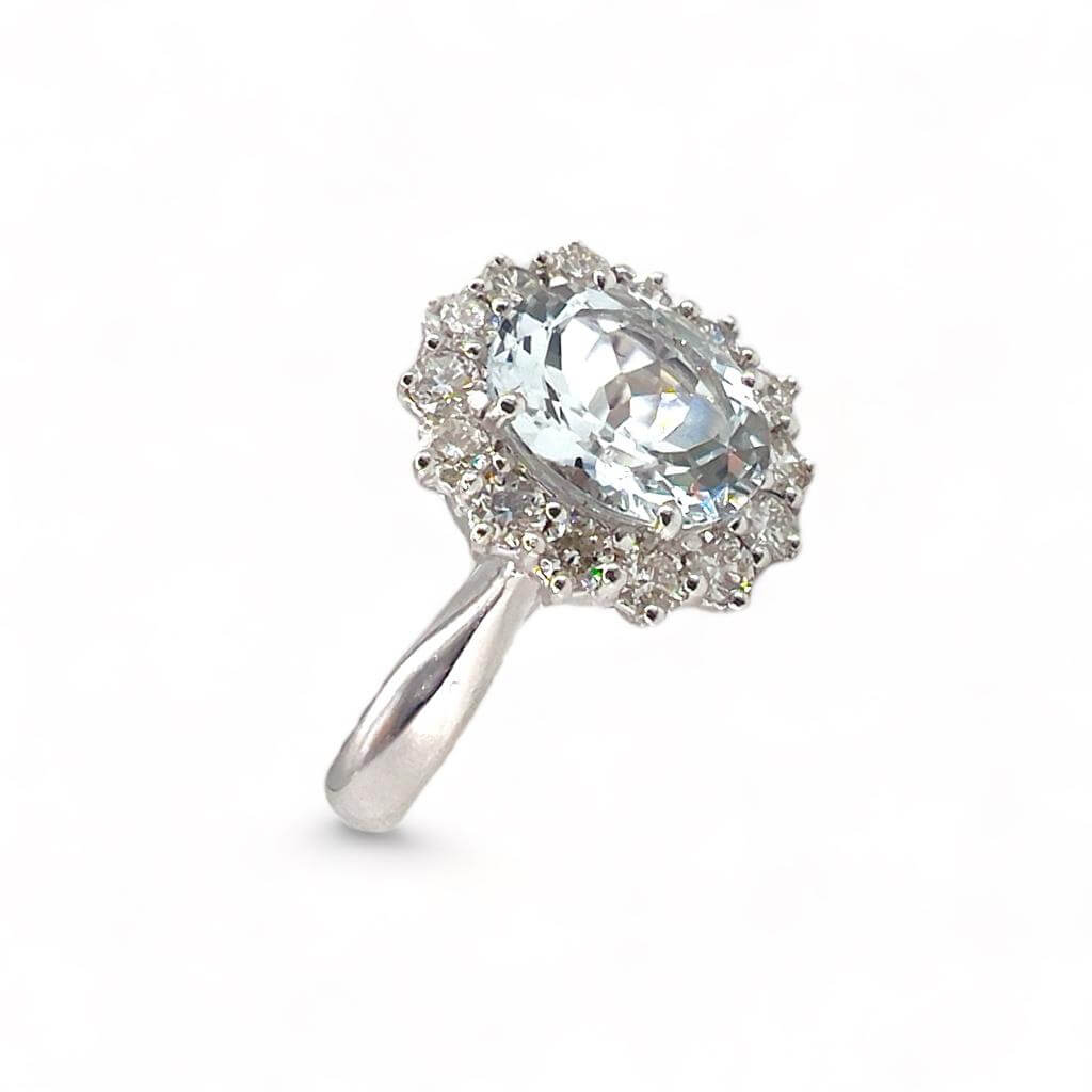 Aquamarine ring and diamonds Cipolla dal 1950 Gioiellieri, handcrafted; Frame in white gold 750% 18 kt, Diamonds brilliant cut weight 0.77 ct color F Purity VVS1 aquamarine weight 2.35 ct oval cut