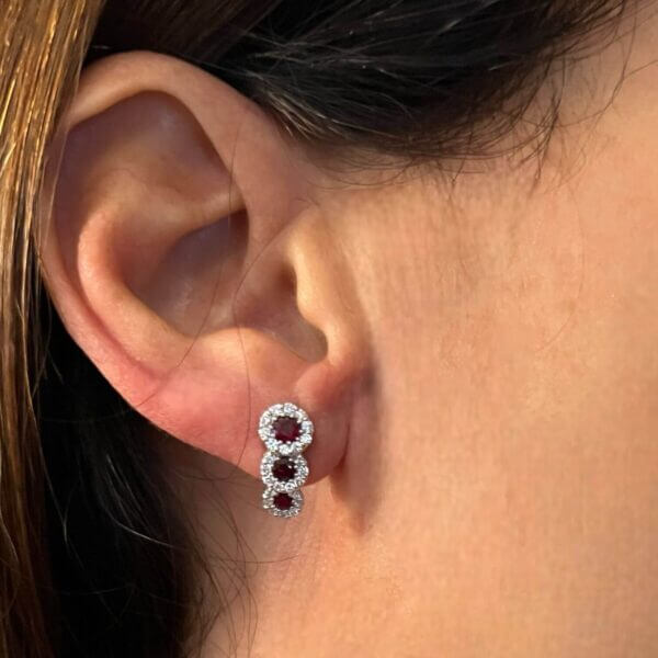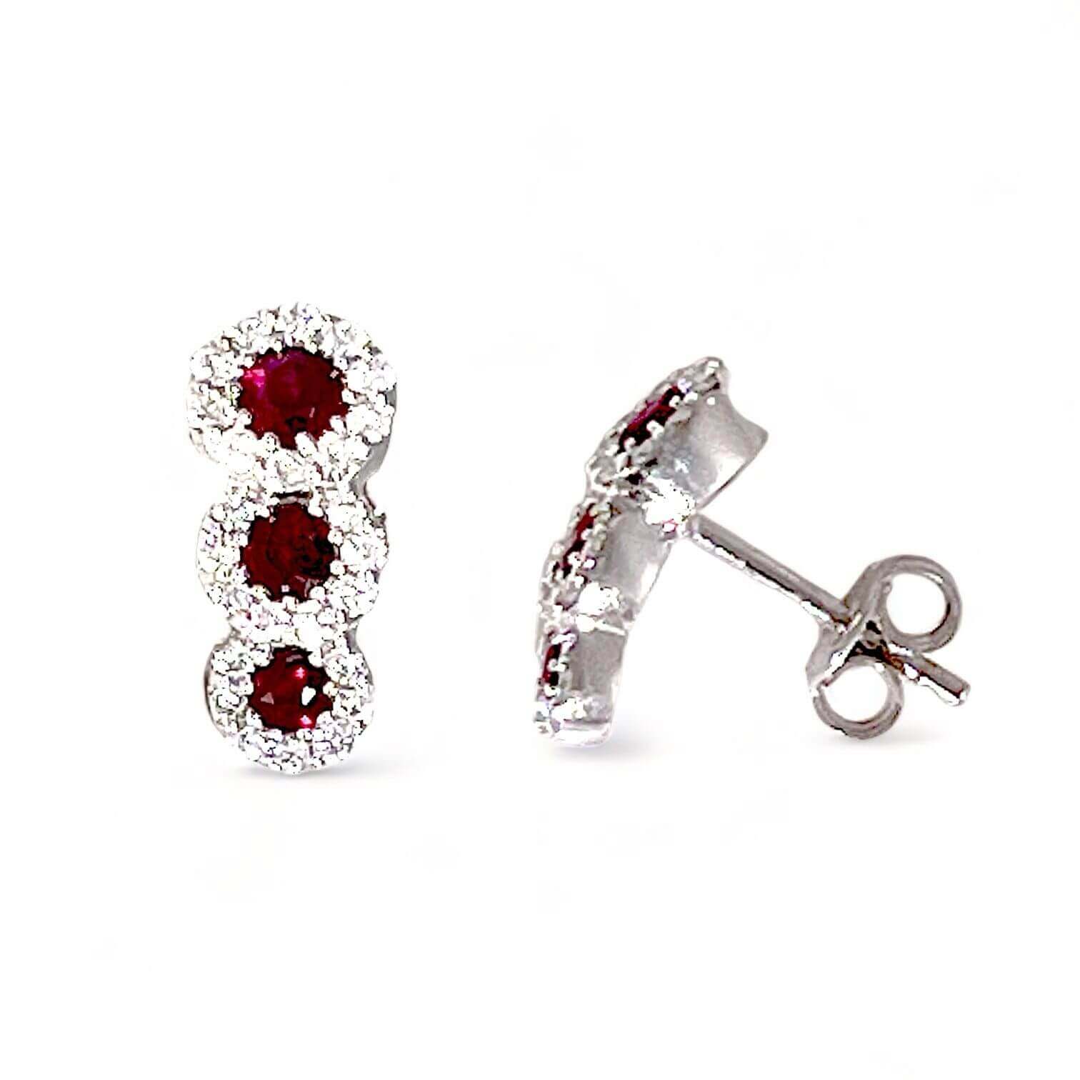 The 750% 18 kt white gold setting gracefully and precisely envelops three precious stones: two expertly cut round rubies, with a total weight of 0.63 ct, and brilliant diamonds of 0.45 ct, with F color and clarity VS1. This sublime combination of gems captures and reflects light with timeless elegance.