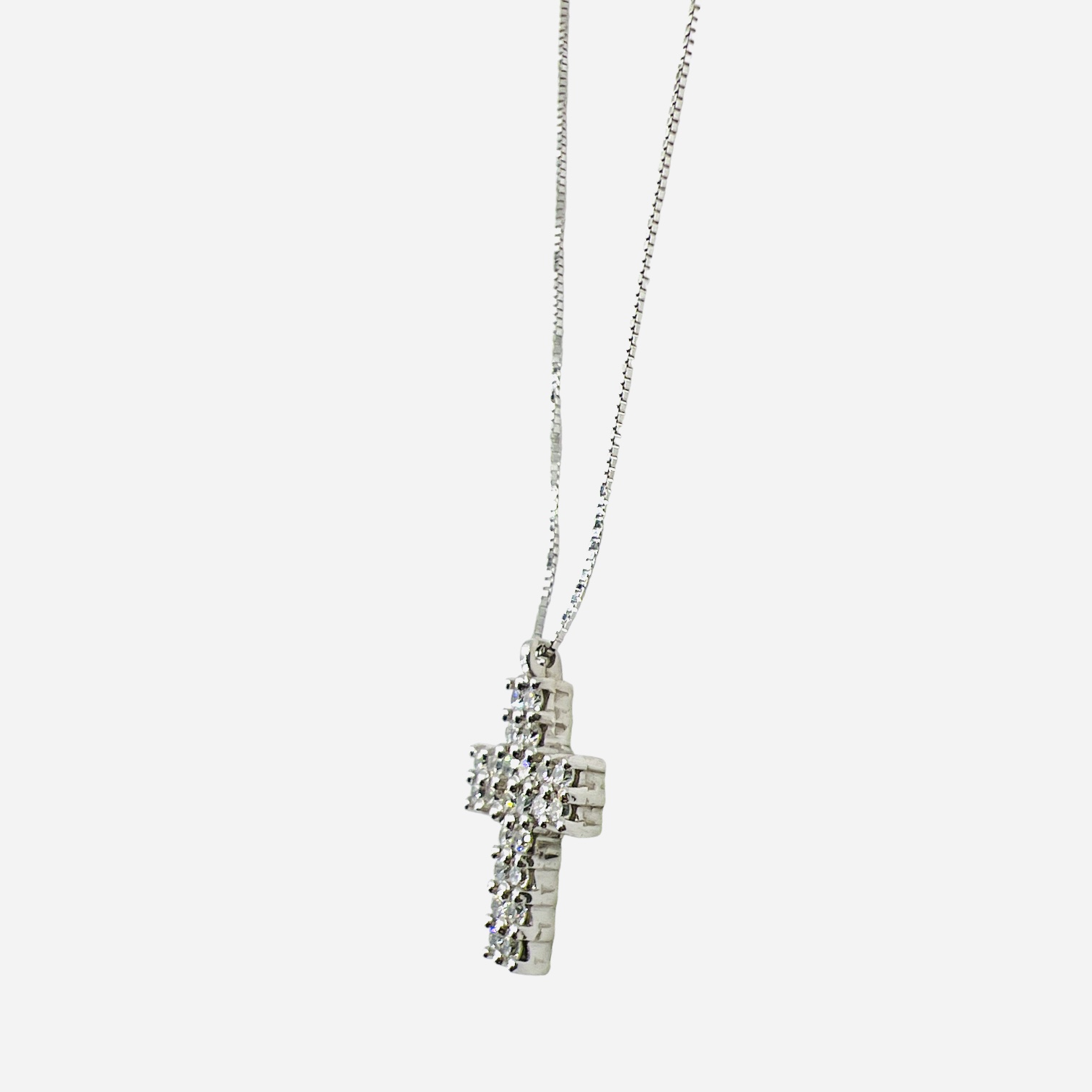 White gold cross pendant 750% 18kt Cipolla dal 1950 Gioiellieri COLLECTION BELLE EPOQUE, handcrafted Venetian chain in 18kt gold; diamonds weight 0.32 ct color F purity vvs1 brilliant cut