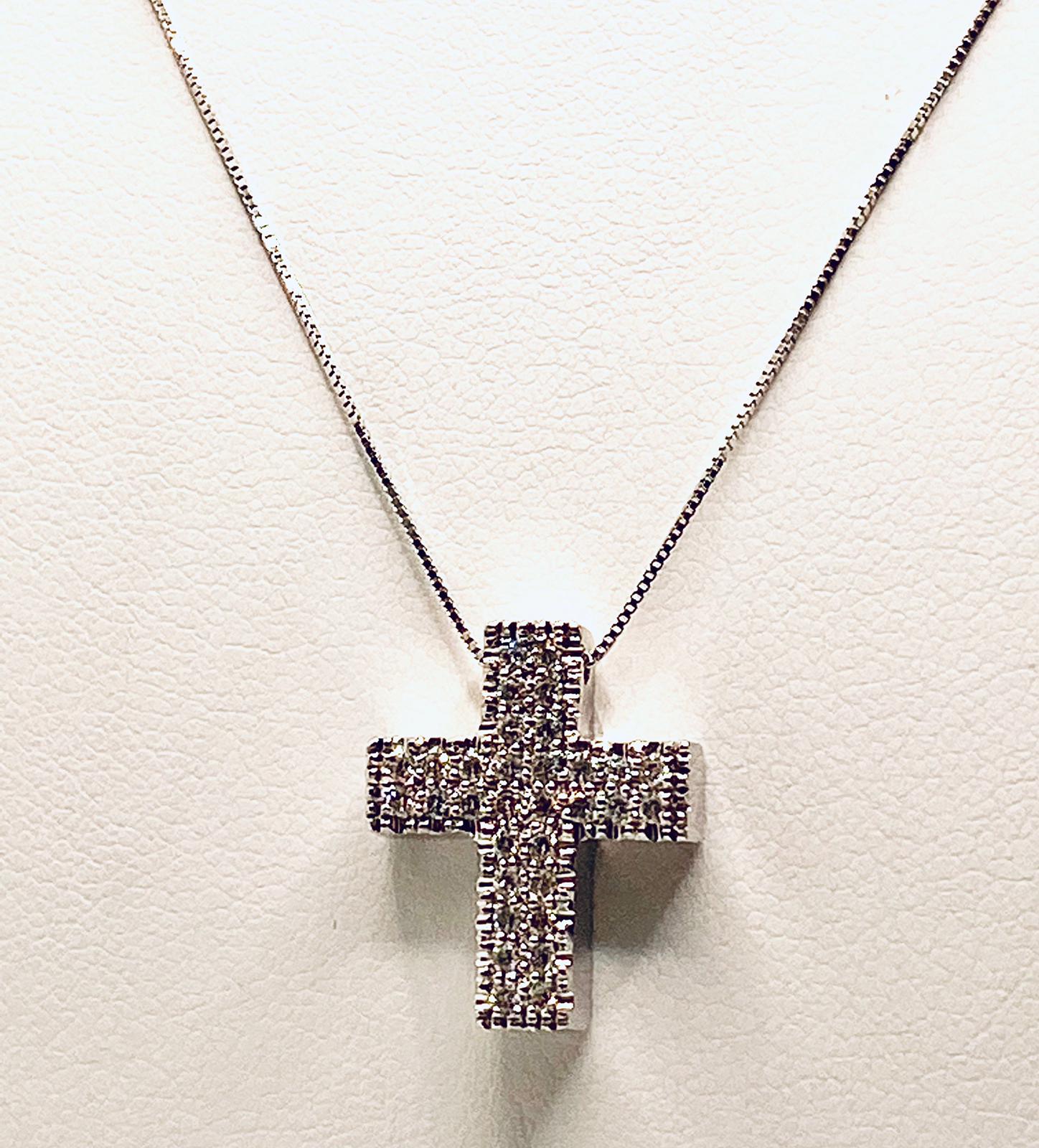 Cross pendant with diamonds Cipolla dal 1950 Gioiellieri handcrafted, Frame in white gold 750% Diamonds cut round brilliant weight 0.29 Ct color F purity VVS1 Chain round neck Venetian knit.