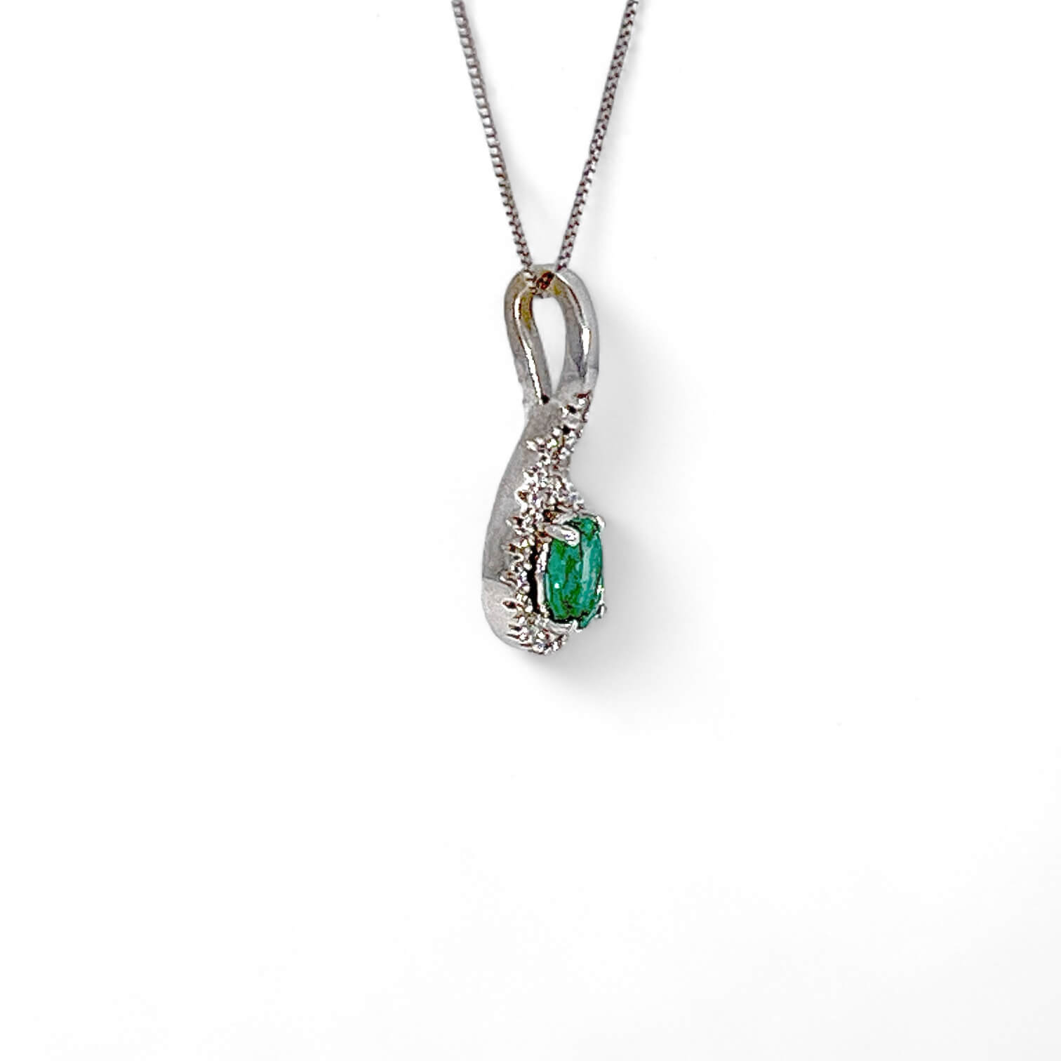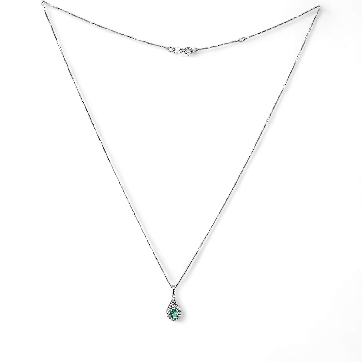 Pendant with emerald and diamonds Cipolla dal 1950 Gioiellieri, handcrafted; Frame in white gold 750% 18 kt, Diamonds brilliant cut weight 0.09 Ct color F purity SI emerald oval cut weight 0.25 ct