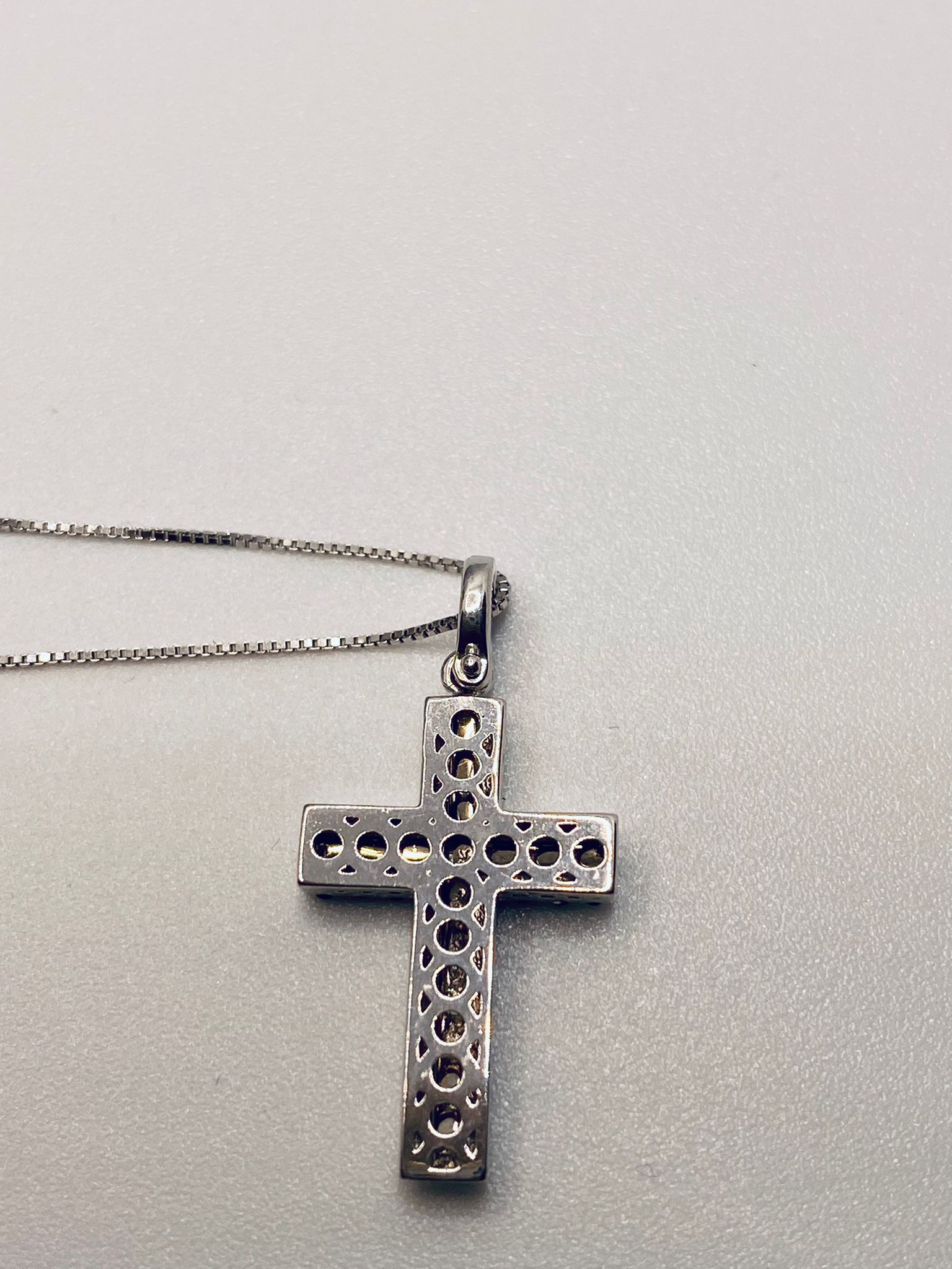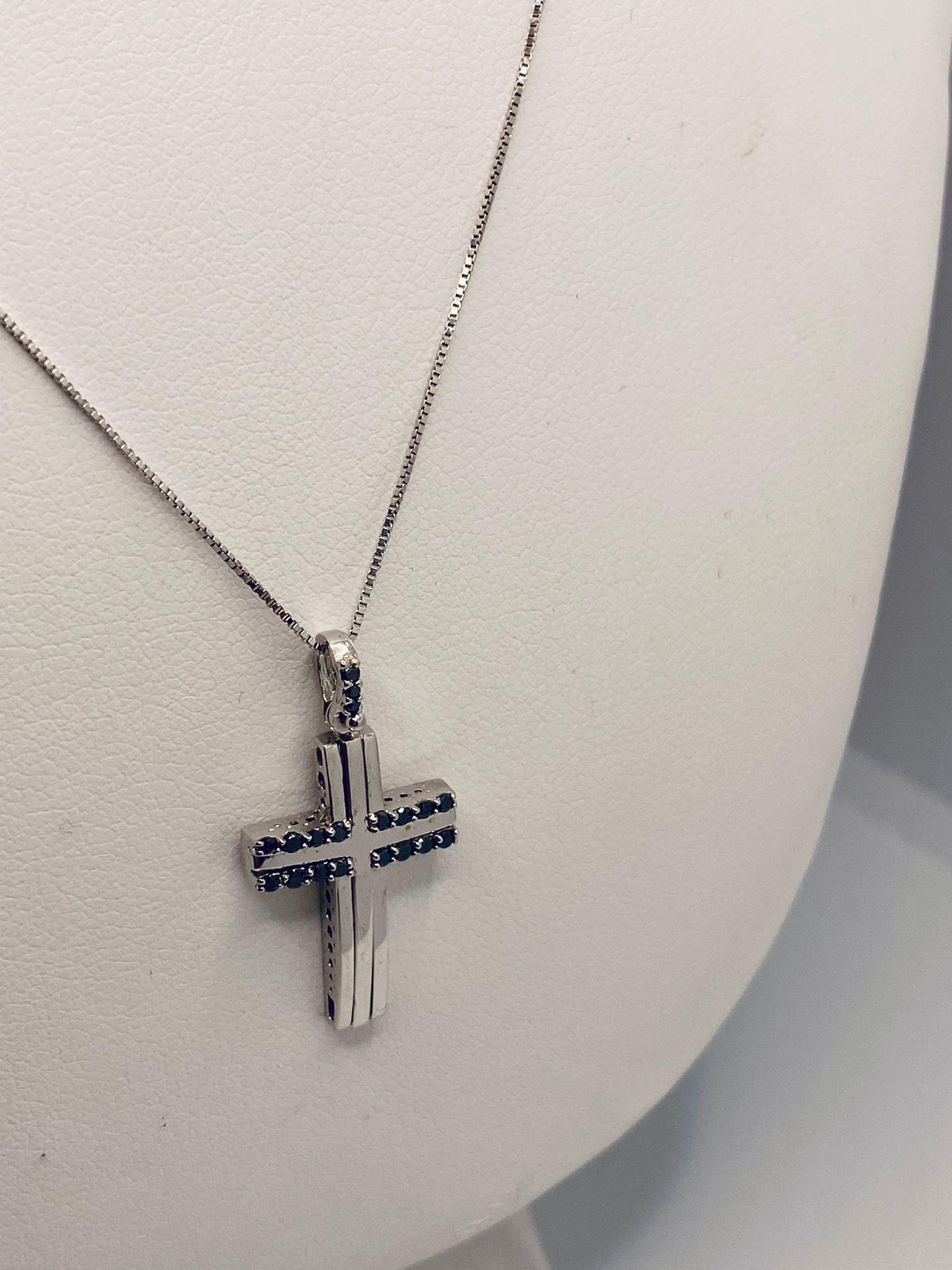 Cross Pendant 3 x 1.5 cm in 18 carat white gold 750% Black Diamonds on Cross and Eyelet Cut Round Brilliant Weight 0.15 Ct Venetian Chain in 18 carat gold 750% Trigger Closure