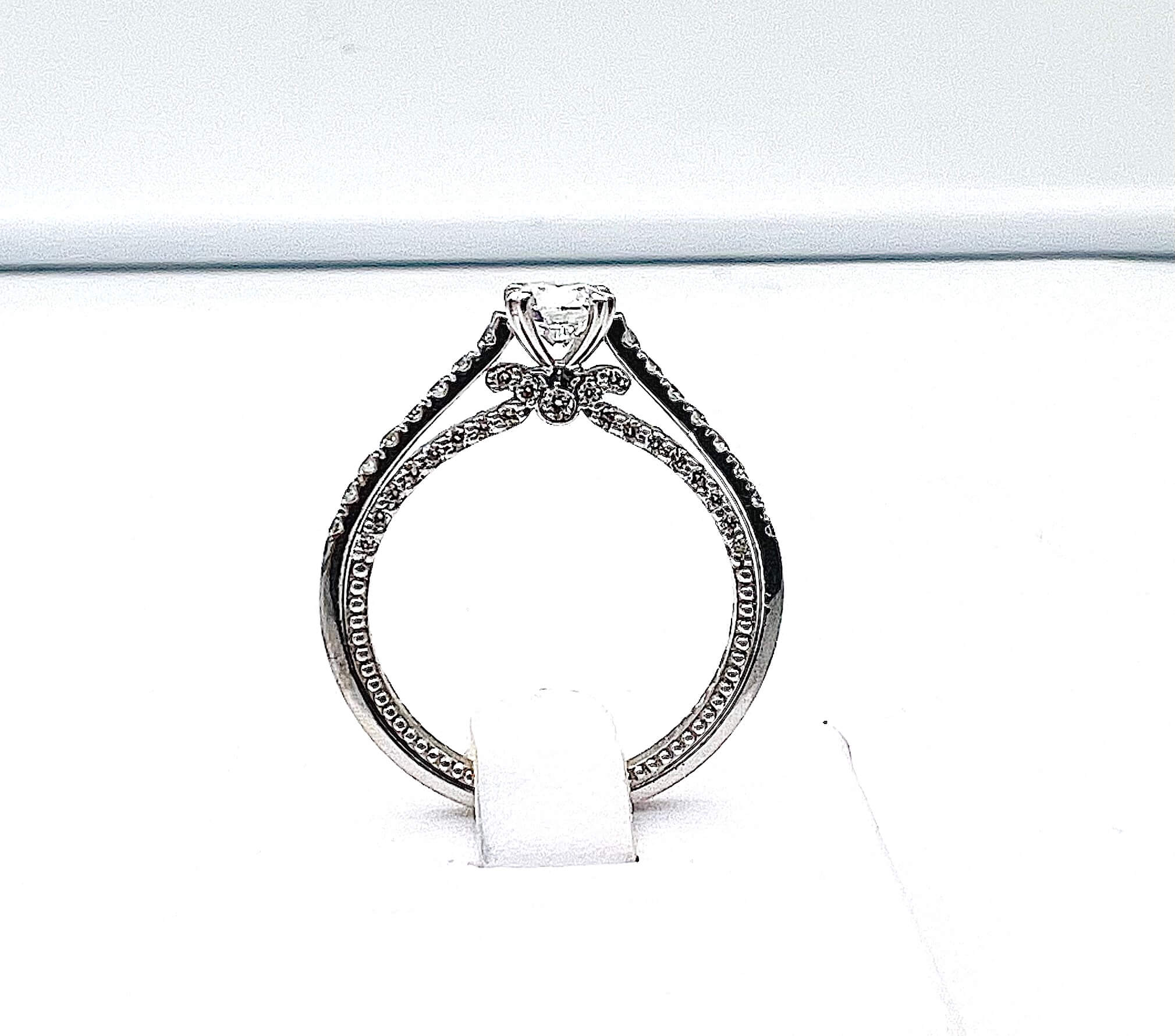 Solitaire ring of diamonds Cipolla dal 1950 Gioiellieri BAROQUE COLLECTION, craftsmanship; Frame in white gold 750%, Central diamond weight 0.49 ct brilliant cut color and purity S1 diamonds on stem 0.43 ct color and purity S1.