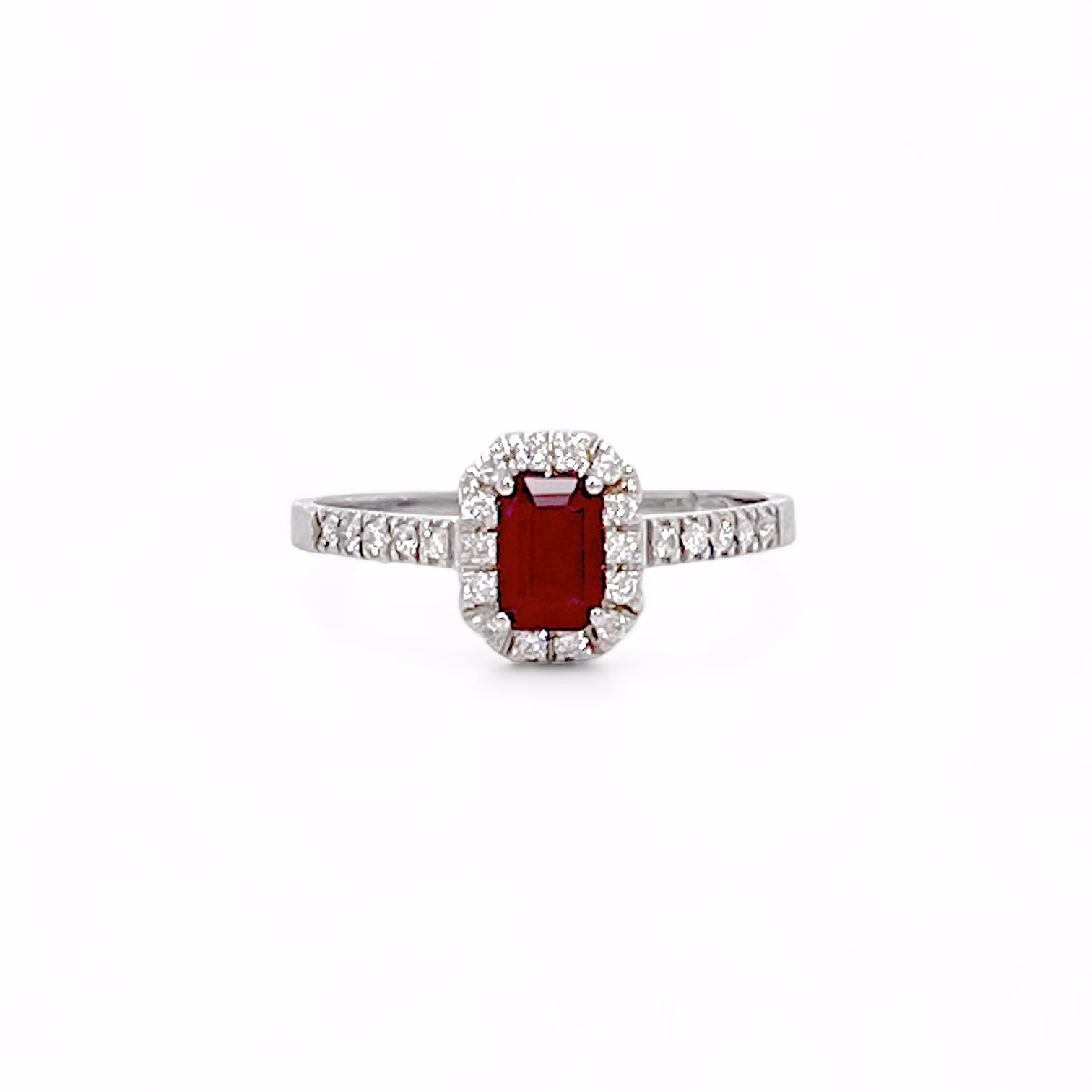 Ruby and diamond ring Cipolla dal 1950 Gioiellieri COLLECTION BELLE EPOQUE, handcrafted, white gold frame 750% 18 KT,Diamonds 0.32 ct color F Purity SI1, Natural ruby weight 0.94 ct emerald cut.