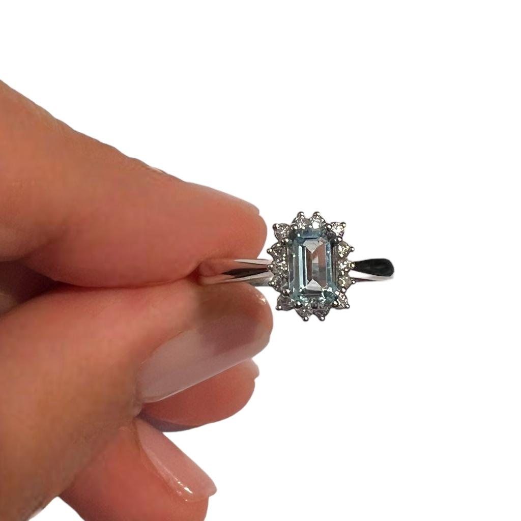 Anello acquamarina e diamanti Cipolla dal 1950 Gioiellieri COLLEZIONE BON TON, lavorazione artigianale; Montatura in oro bianco 750% 18 kt, Diamanti taglio brillante peso 0,15 ct colore F Purezza VS1 acquamarina peso 0,47 ct taglio smeraldo