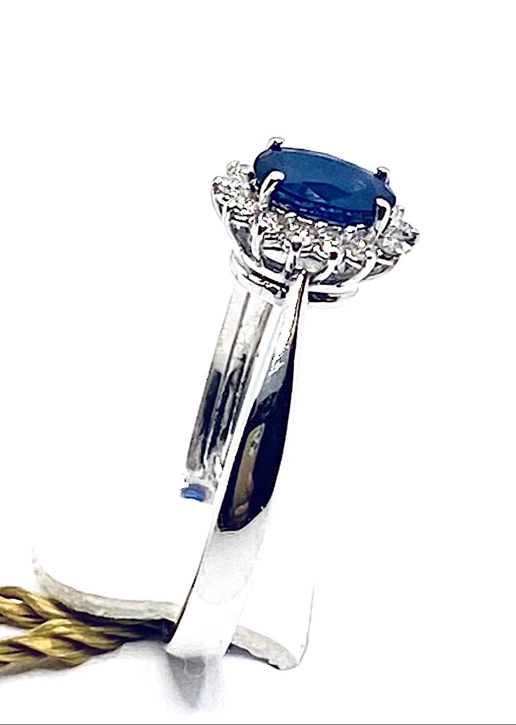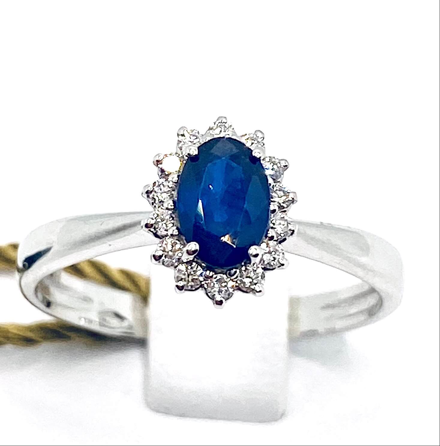 Anello con zaffiro e diamanti Cipolla dal 1950 GIOIELLI COLLEZIONE BON TON Lavorazione artigianale, Montatura in oro bianco 750% incastonatura con griffe su castone centrale Zaffiro provenienza Sri Lanka Taglio ovale Colore blu velluto peso 0,56 ct. Diamanti peso 0,12 ct, taglio round brilliant colore F purezza VS1.