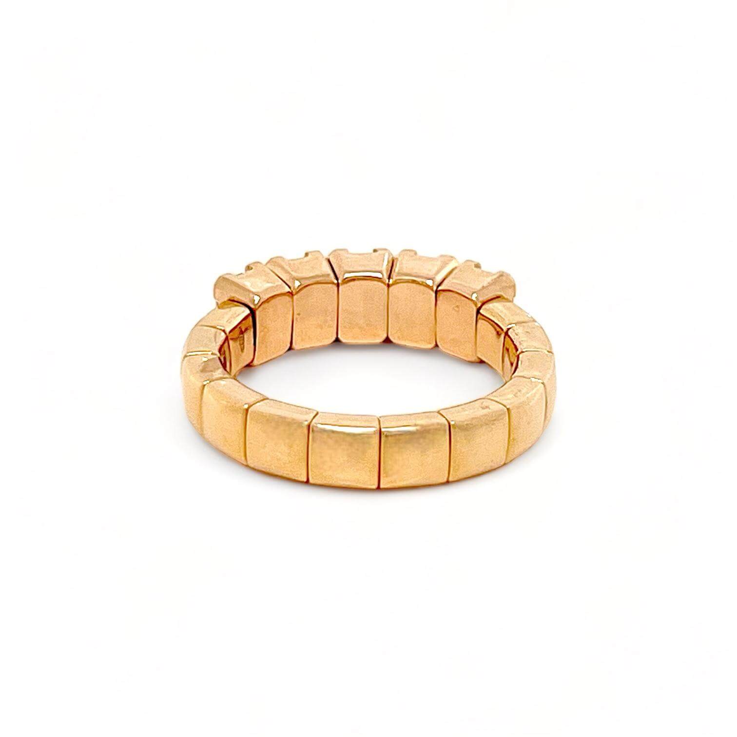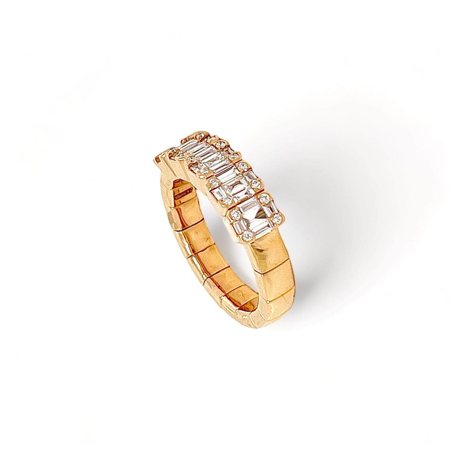 L’Anello Elastico Oro Rosa e Diamanti della Collezione BAGUETTE di Cipolla dal 1950 Gioiellieri è una creazione sublime, dove l’arte artigianale si fonde con la bellezza intrinseca dei materiali pregiati. La lavorazione artigianale si manifesta attraverso la montatura in oro rosa 750%, una scelta sofisticata e raffinata che impreziosisce ogni dettaglio di questo gioiello unico.
