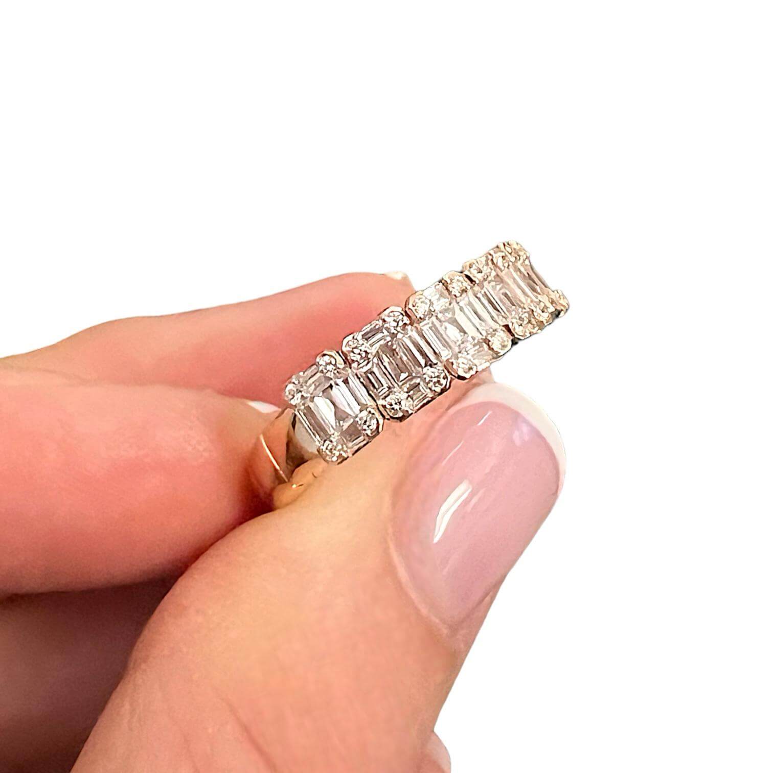 L’Art. MOLLA1 è un capolavoro della gioielleria di lusso, con la Collezione BAGUETTE che rivela la sua magnificenza attraverso diamanti taglio baguette e brillante, totalizzando un peso di 0,70 ct. La luminosità di queste pietre, con una classificazione di colore F e purezza VS1, conferisce all’anello una scintillante brillantezza, catturando lo sguardo e creando un effetto unico.