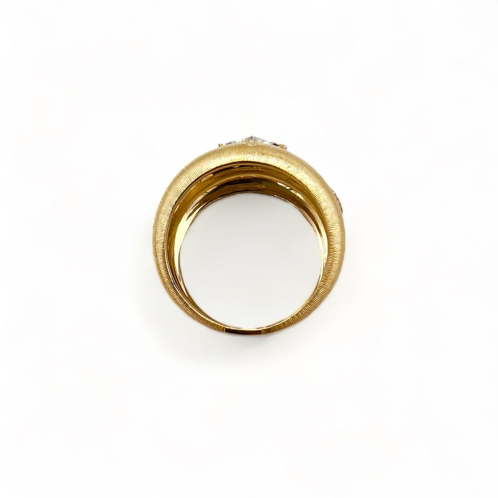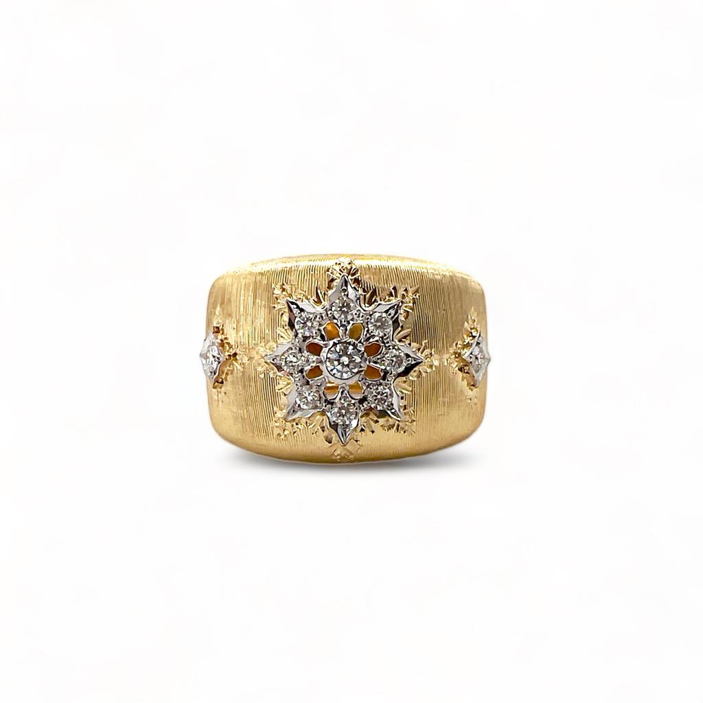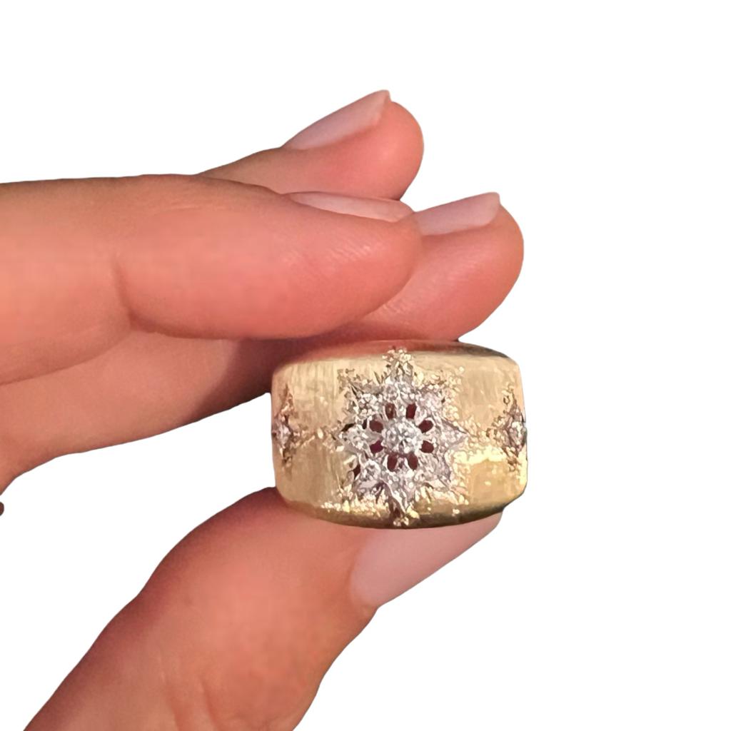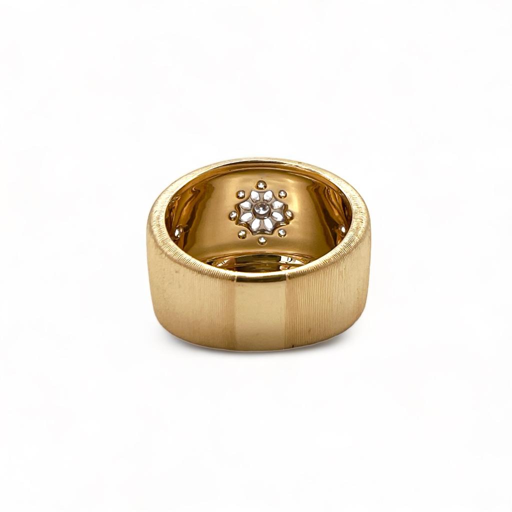 Anello fascetta in oro giallo e bianco 18 carati 750%, lavorazione interamente artigianale Cipolla Gioielli realizzazione a merletto tecniche utilizzate intaglio e cesello. Diamanti taglio round brilliant peso 0,28 ct, colore F purezza Vs1.