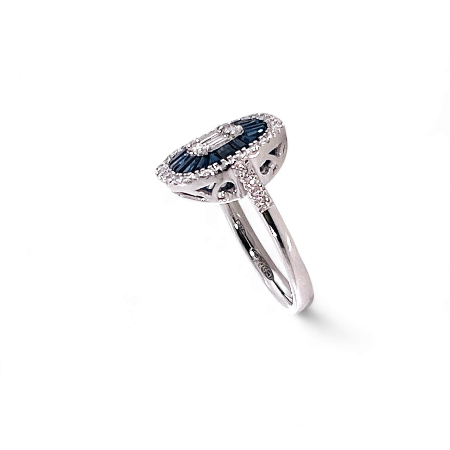 Anello zaffiro e diamanti art. 131317 della collezione BELLE EPOQUE, realizzato in oro bianco 18kt. Un gioiello dal fascino senza tempo, che unisce l’eleganza del zaffiro blu naturale alla brillantezza dei diamanti, firmato Cipolla dal 1950 Gioiellieri.
