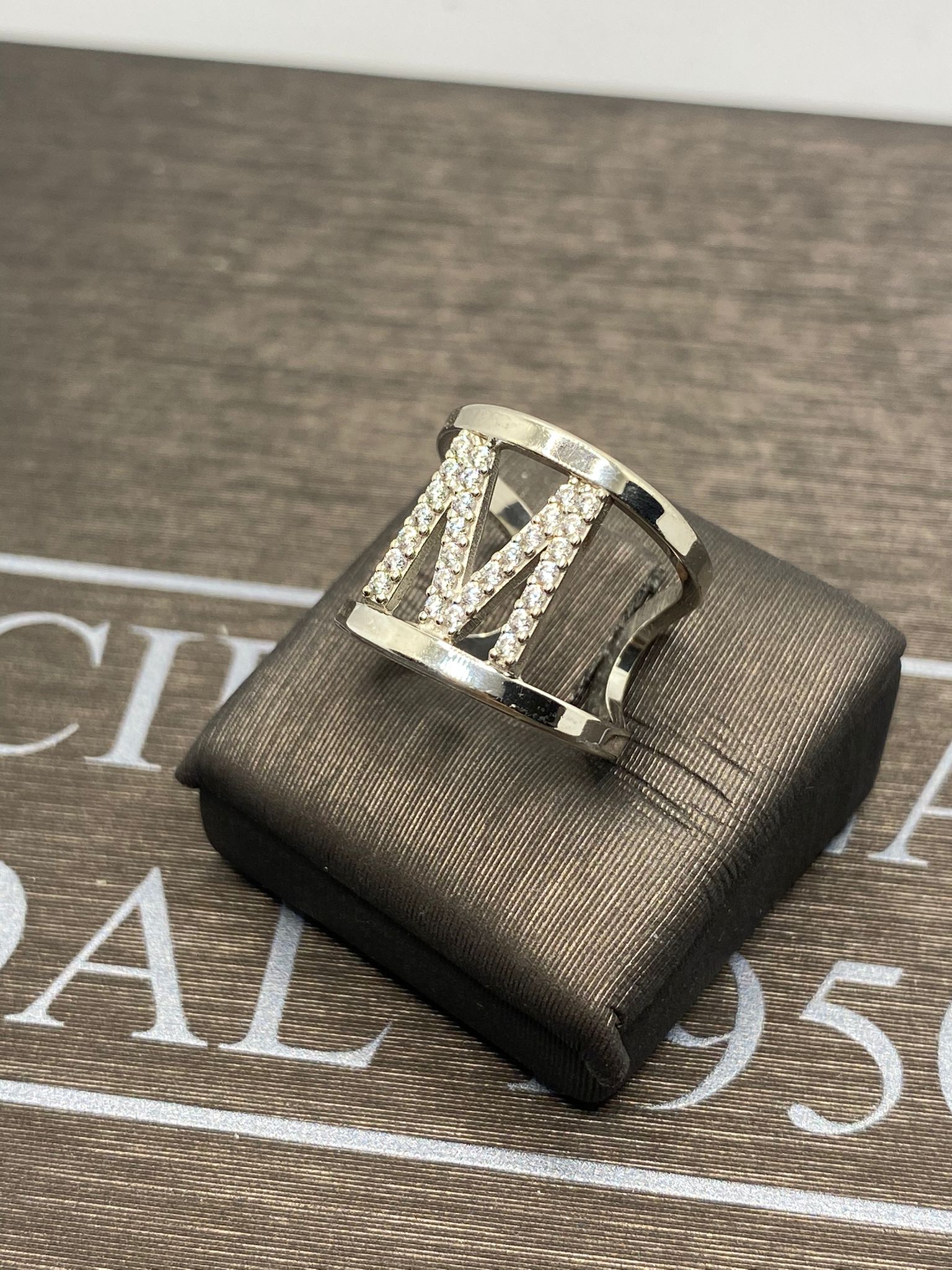 anello iniziali lettera M argento 925% white gold e cristalli bianchi. Misura regolabile
