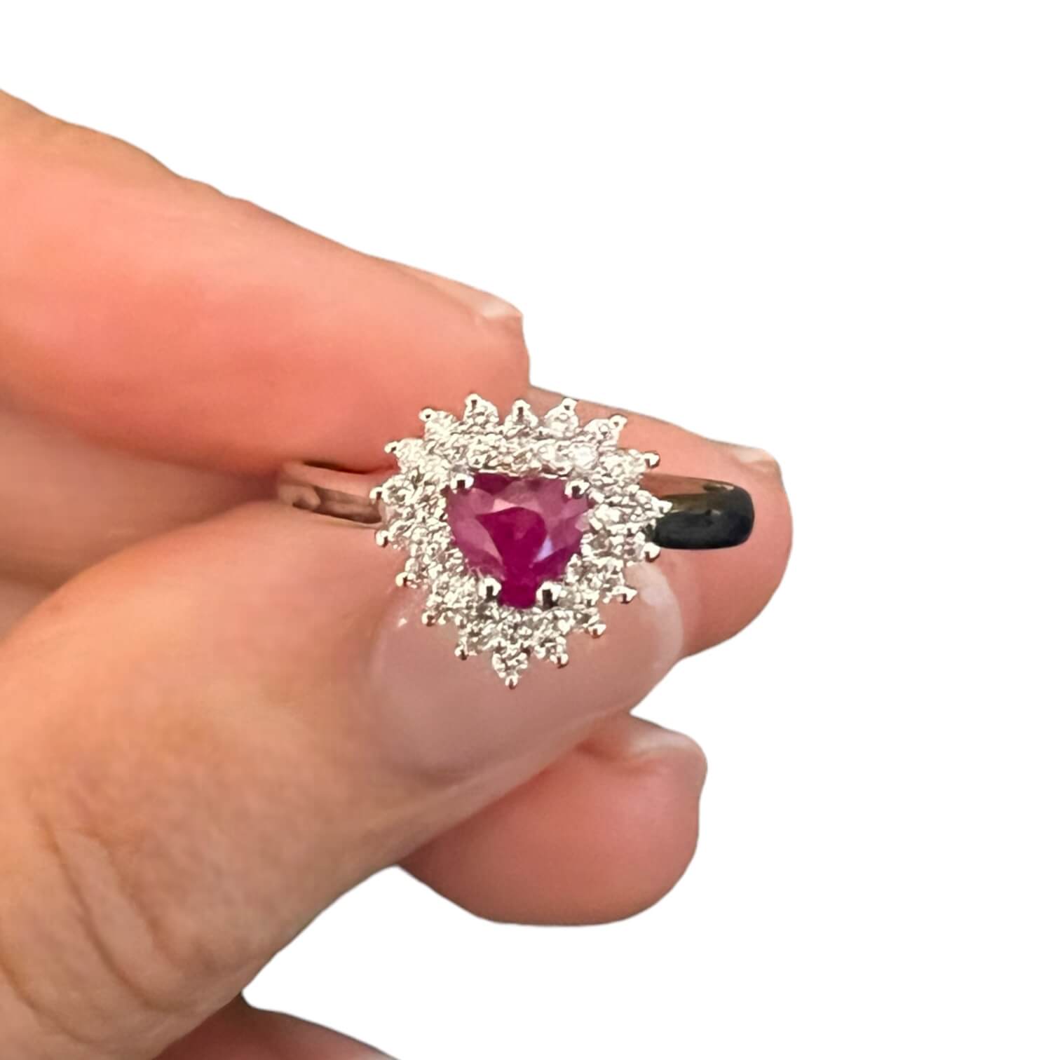 Anello con rubino e diamanti Cipolla dal 1950 Gioiellieri COLLEZIONE CUORE, Lavorazione artigianale; Montatura in oro bianco 750% Rubino peso 0,64 ct taglio a cuore, Diamanti taglio round brilliant peso 0,26 Ct colore F purezza VS1