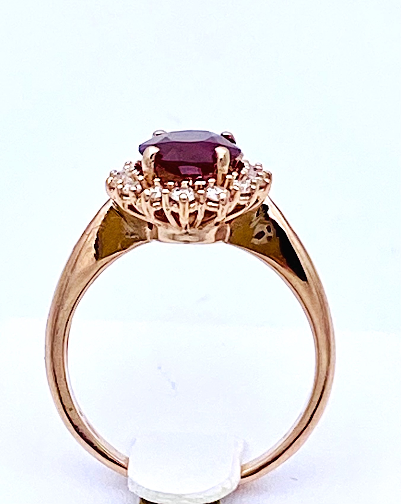 Anello con rubino e diamanti Cipolla dal 1950 Gioiellieri COLLEZIONE BON TON,Lavorazione artigianale; Montatura in oro rosa 750% 18 KT, Rubino peso 1,66 ct taglio ovale, Diamanti taglio brillante peso 0,36 Ct colore F purezza VVS2