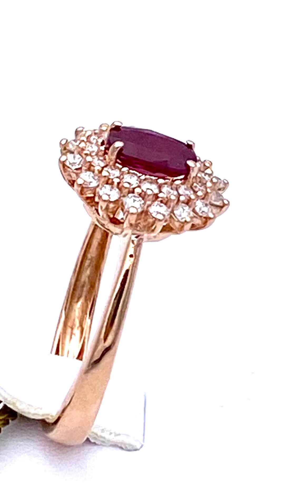 Anello con rubino e diamanti Cipolla dal 1950 Gioiellieri COLLEZIONE BON TON, Lavorazione artigianale; Montatura in oro rosa 750% 18 KT, Rubino peso 1,00 ct taglio ovale, Diamanti taglio brillante peso 0,48 Ct colore F purezza VS1