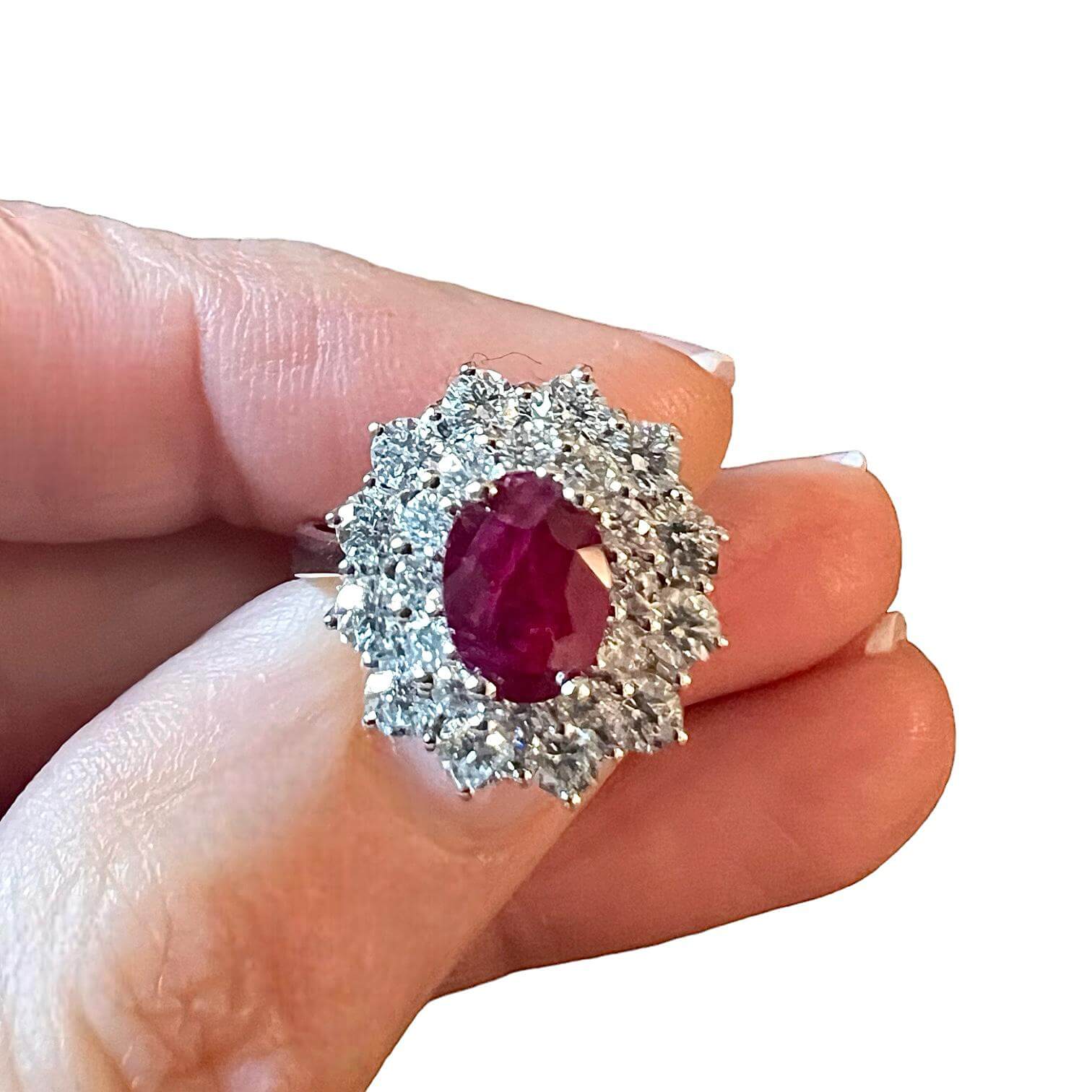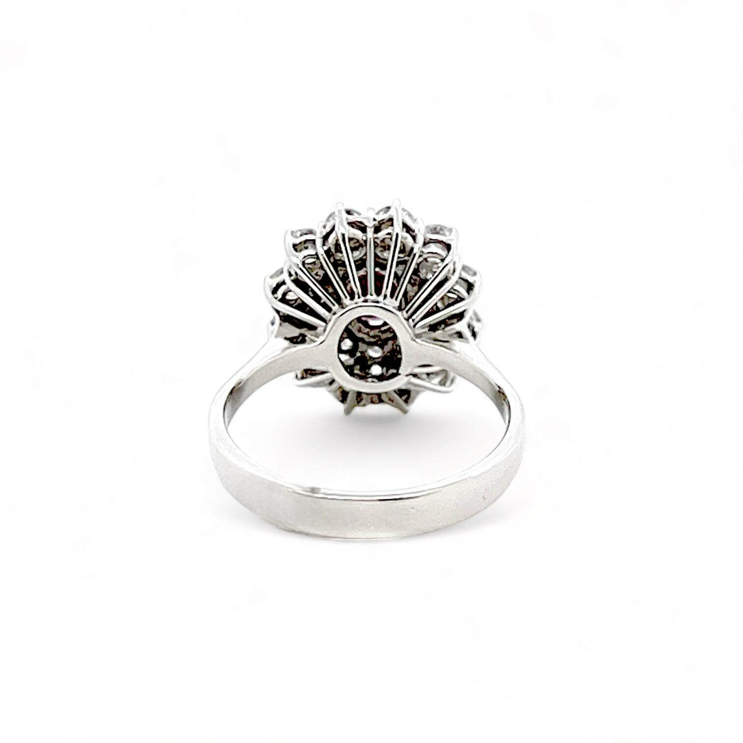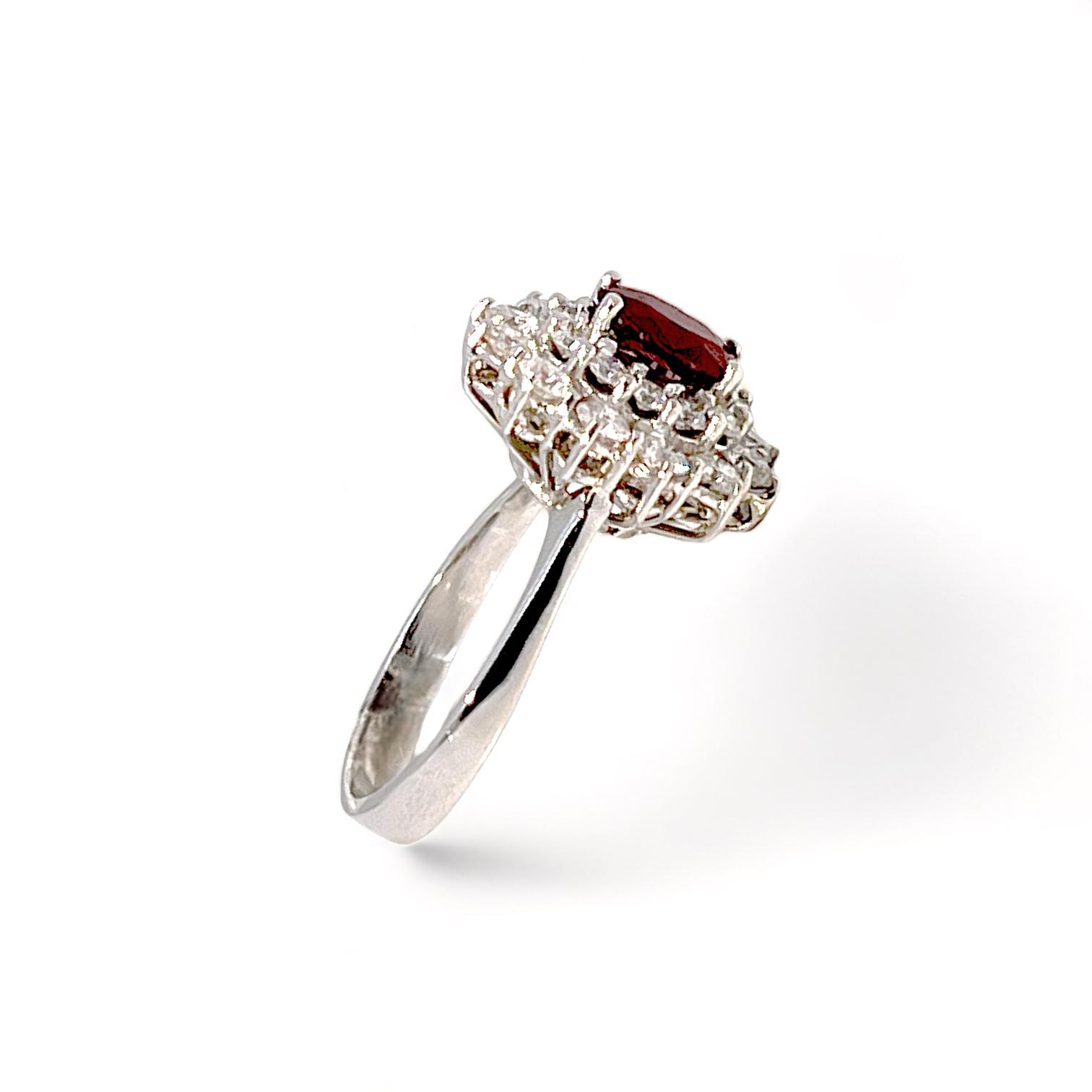 Anello rubino e diamanti oro bianco 750% 18kt Cipolla dal 1950 Gioielli COLLEZIONE BON TON, lavorazione artigianale montatura in oro bianco 750% 18 kt Diamanti 1,18 ct colore E VVS2 taglio brillante Rubino 1,20 ct taglio ovale