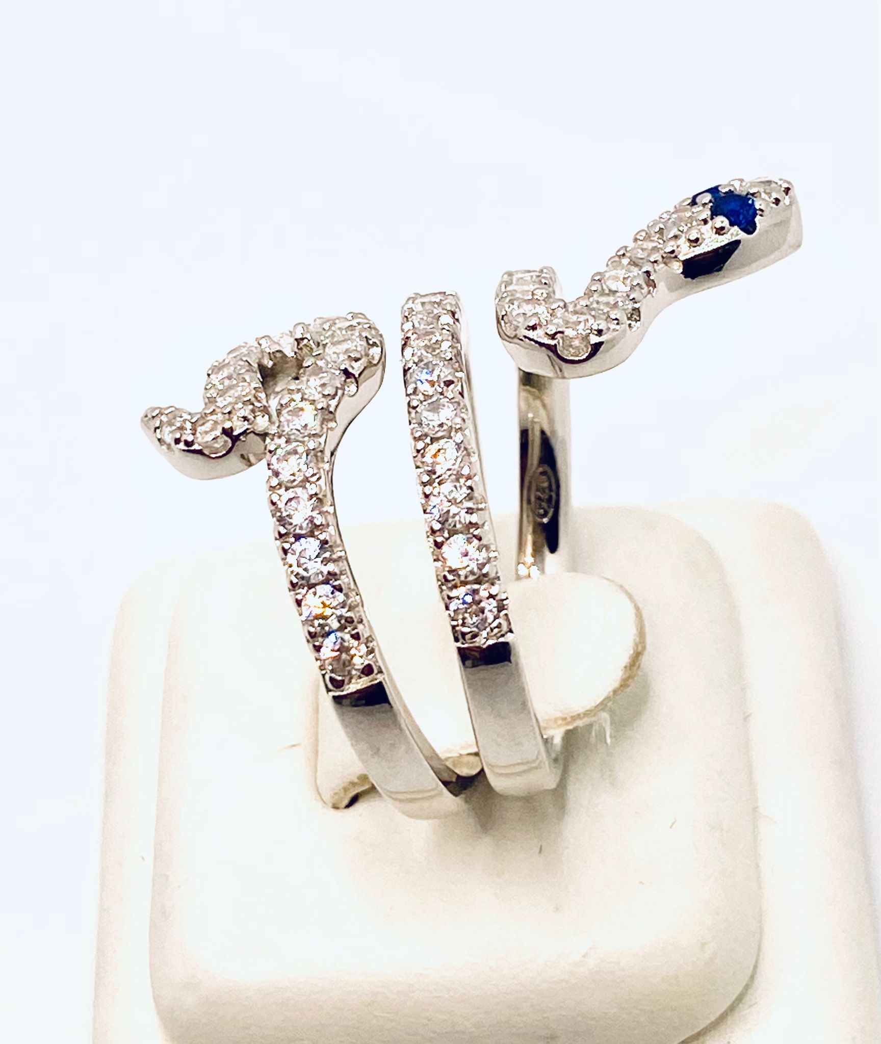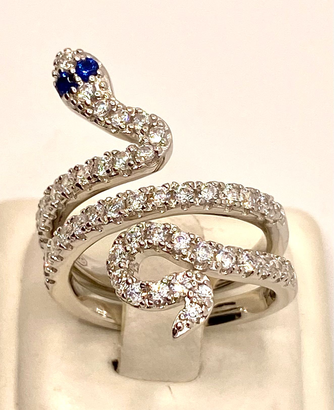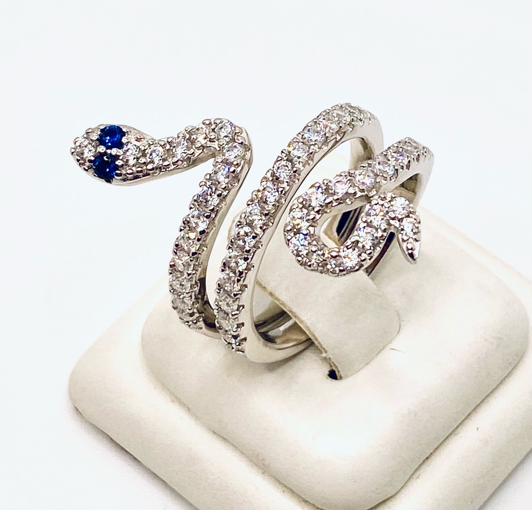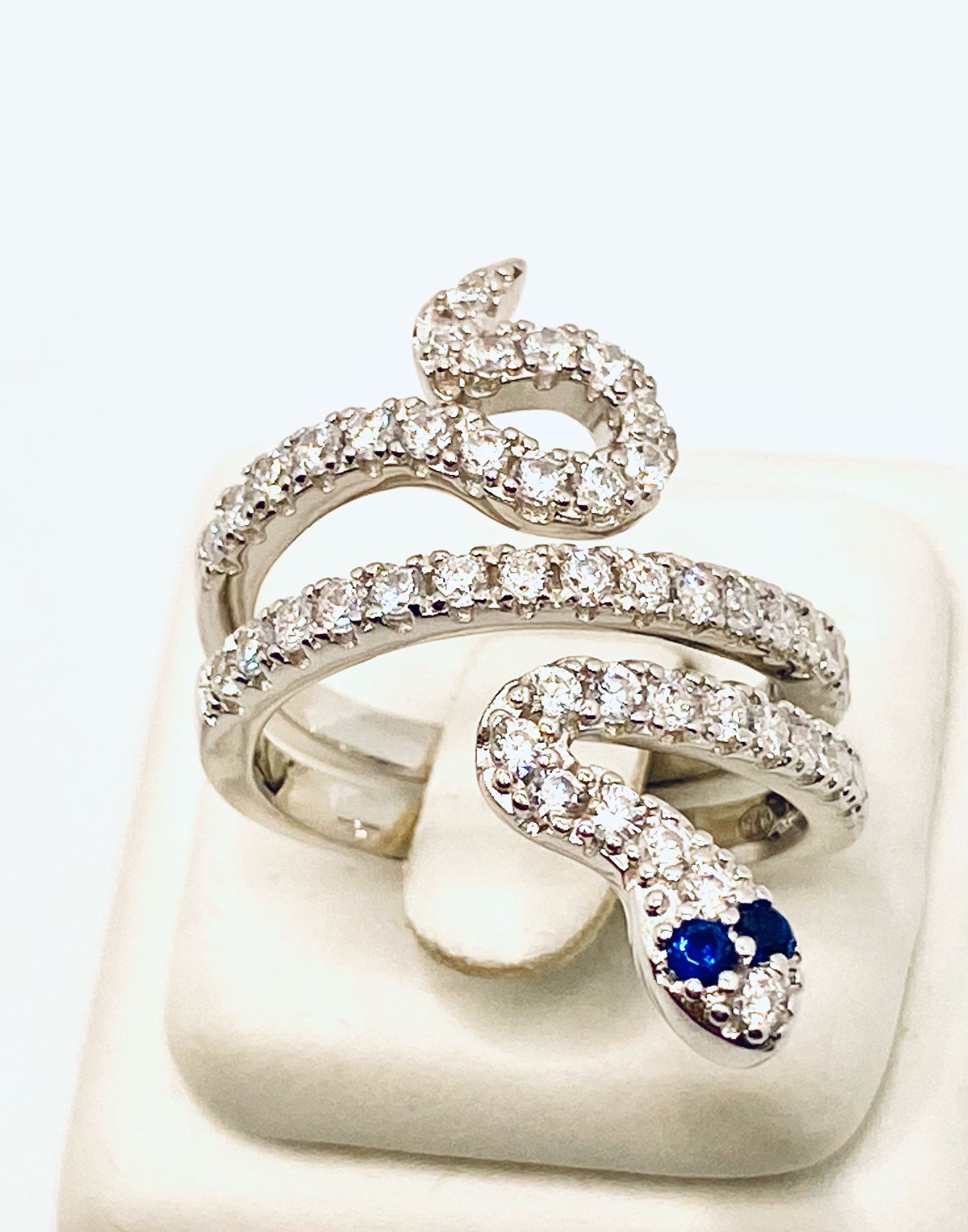 Anello serpente in argento 925% placcatura in bianco con cristalli naturali bianchi e blu