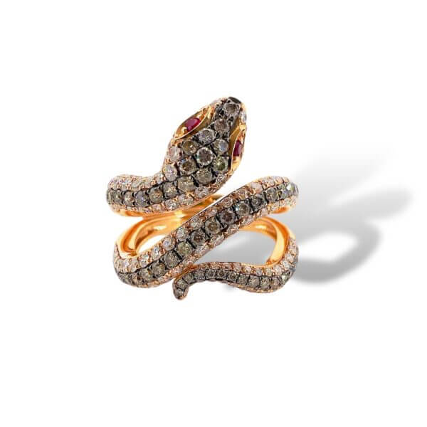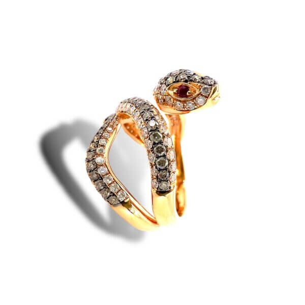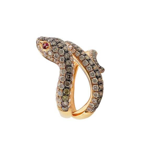 Anello in oro osa 750% ANIMALIER modello serpente diamanti bianchi 0,66 ct F/VS1, Diamanti brown 1,03 ct , rubini 0,03 ct Cipolla dal 1950 Gioielli ART. R38578-3001