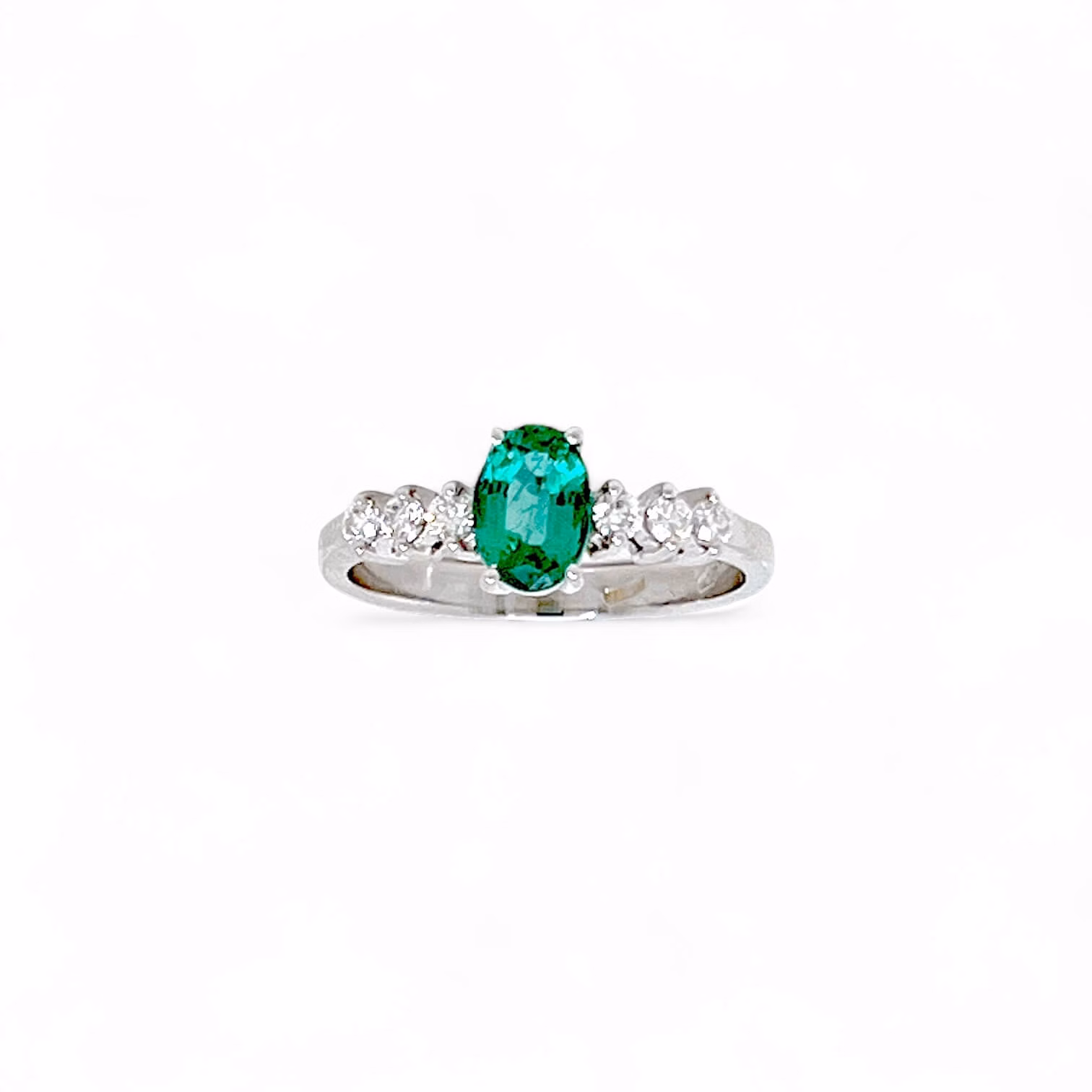 Anello con smeraldo e diamanti Cipolla dal 1950 Gioiellieri COLLEZIONE GEMME, lavorazione artigianale, montatura in oro bianco 750% 18 kt. Smeraldi caratura 0,40 taglio ovale. Diamanti peso 0.14 Ct colore F purezza VS1 taglio brillante