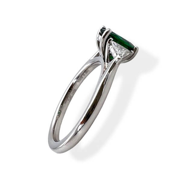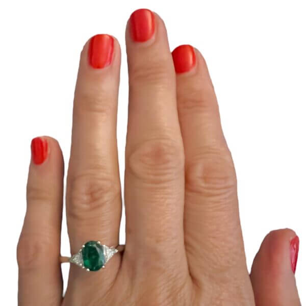 Anello con smeraldo e diamanti Cipolla dal 1950 Gioielli COLLEZIONE GEMME, lavorazione artigianale; Montatura in oro bianco 18 Kt 750% Smeraldo Colombia peso 1,01 ct taglio ovale Diamanti taglio trillion peso 0,28 Ct colore D purezza VS1