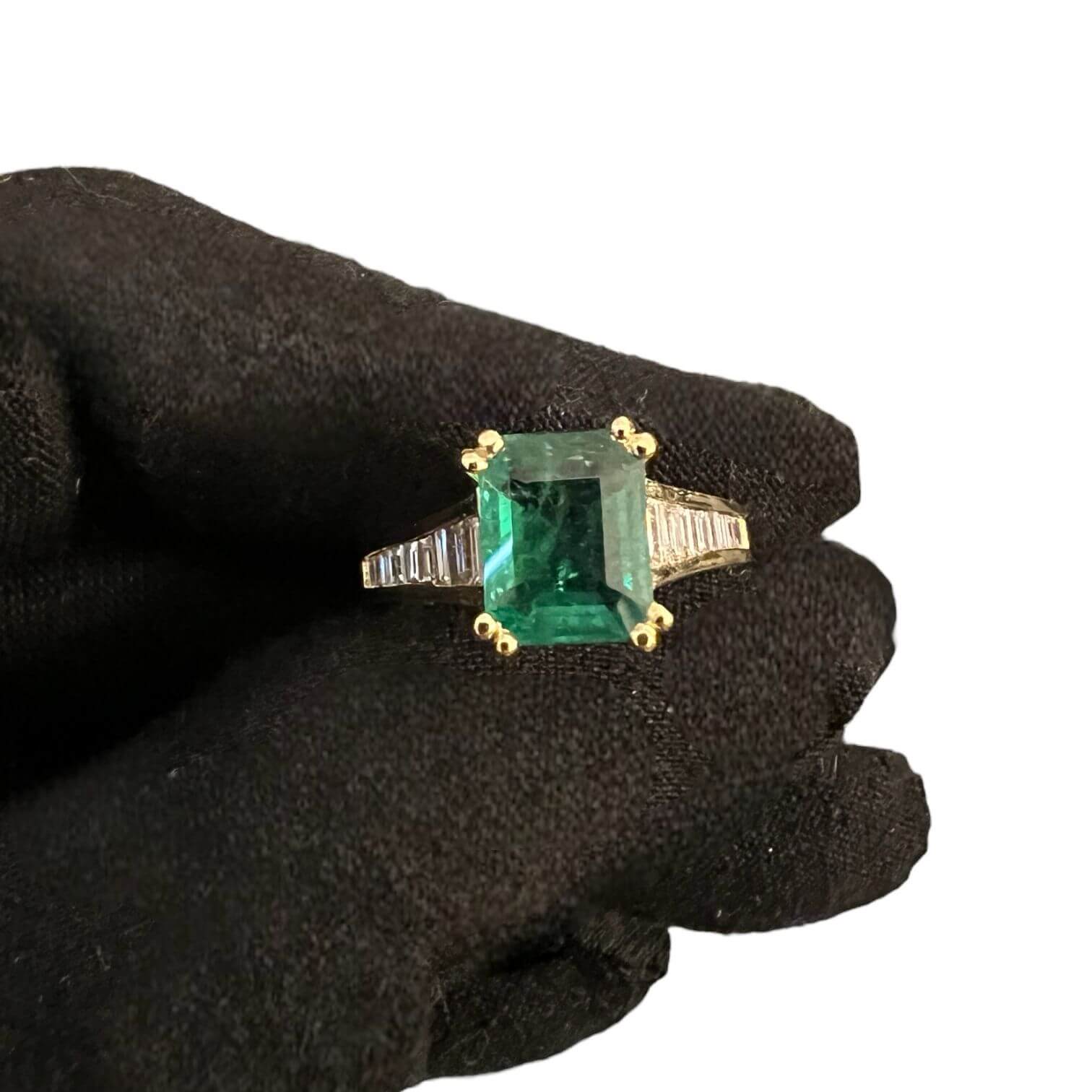 L’Anello con Smeraldo e Diamanti della Collezione GEMME di Cipolla dal 1950 Gioiellieri incanta con la sua bellezza senza tempo. Questo anello, caratterizzato da una lavorazione artigianale impeccabile, presenta uno splendido smeraldo colombiano e diamanti taglio baguette montati su una montatura in oro giallo 18 Kt 750%.