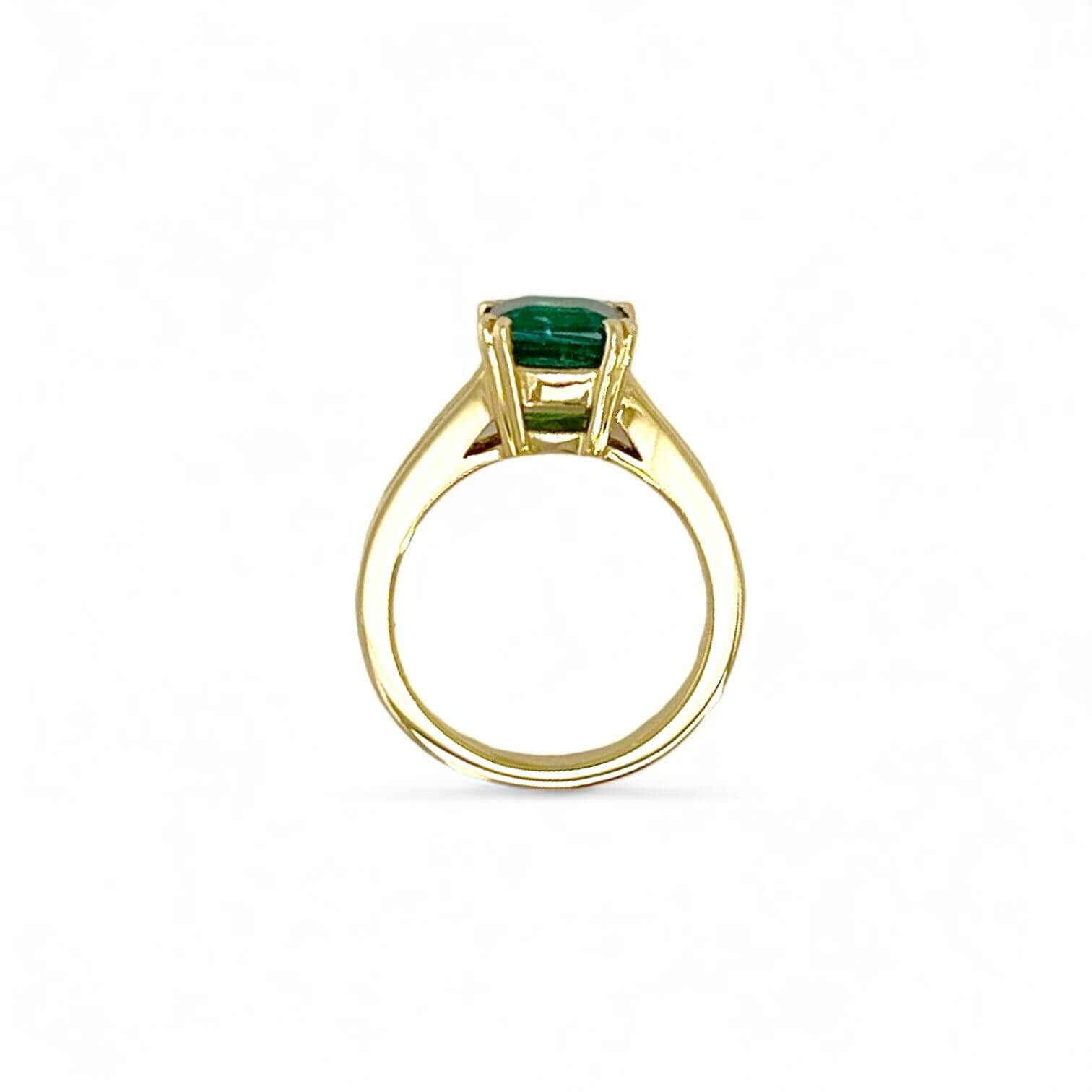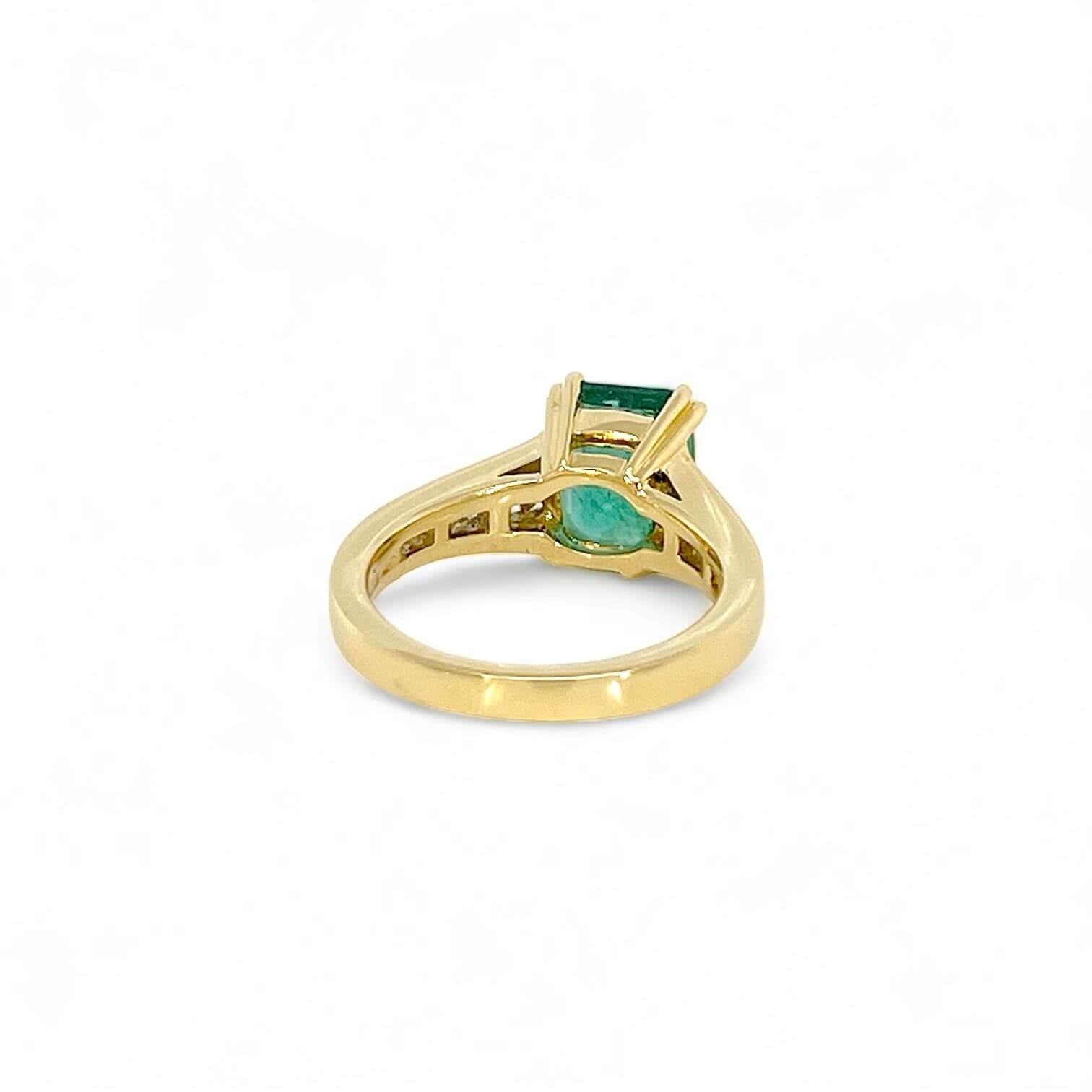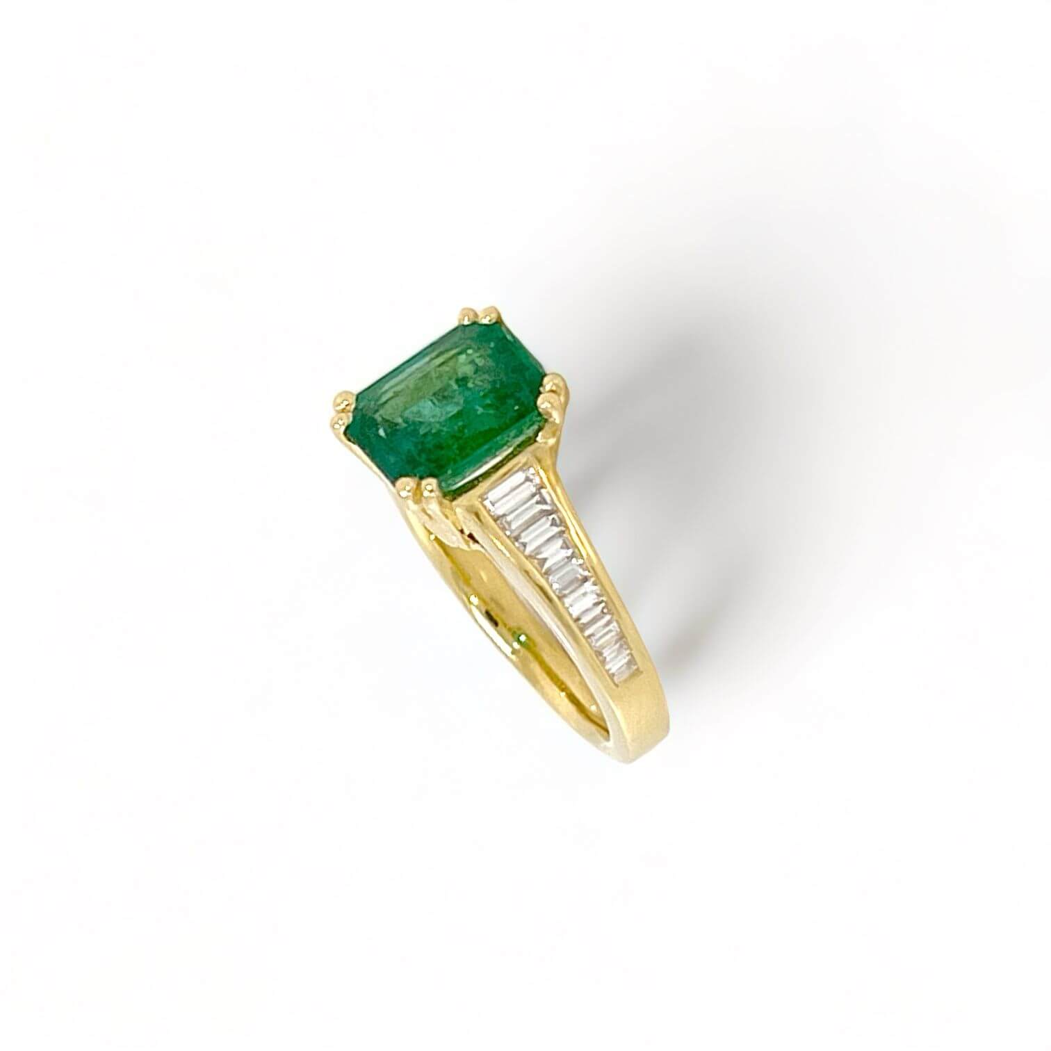 La montatura in oro giallo 18 Kt 750% offre un’eleganza classica e calda, mentre lo smeraldo colombiano, con una caratura di 2,45 Ct, cattura lo sguardo con la sua vivace tonalità verde e il taglio smeraldo che evidenzia la purezza delle sue linee. Ad arricchire ulteriormente l’anello, diamanti taglio baguette, con una caratura di 0,52 Ct, caratterizzati da colore F e purezza VS1, aggiungono un tocco di luce e brillantezza.