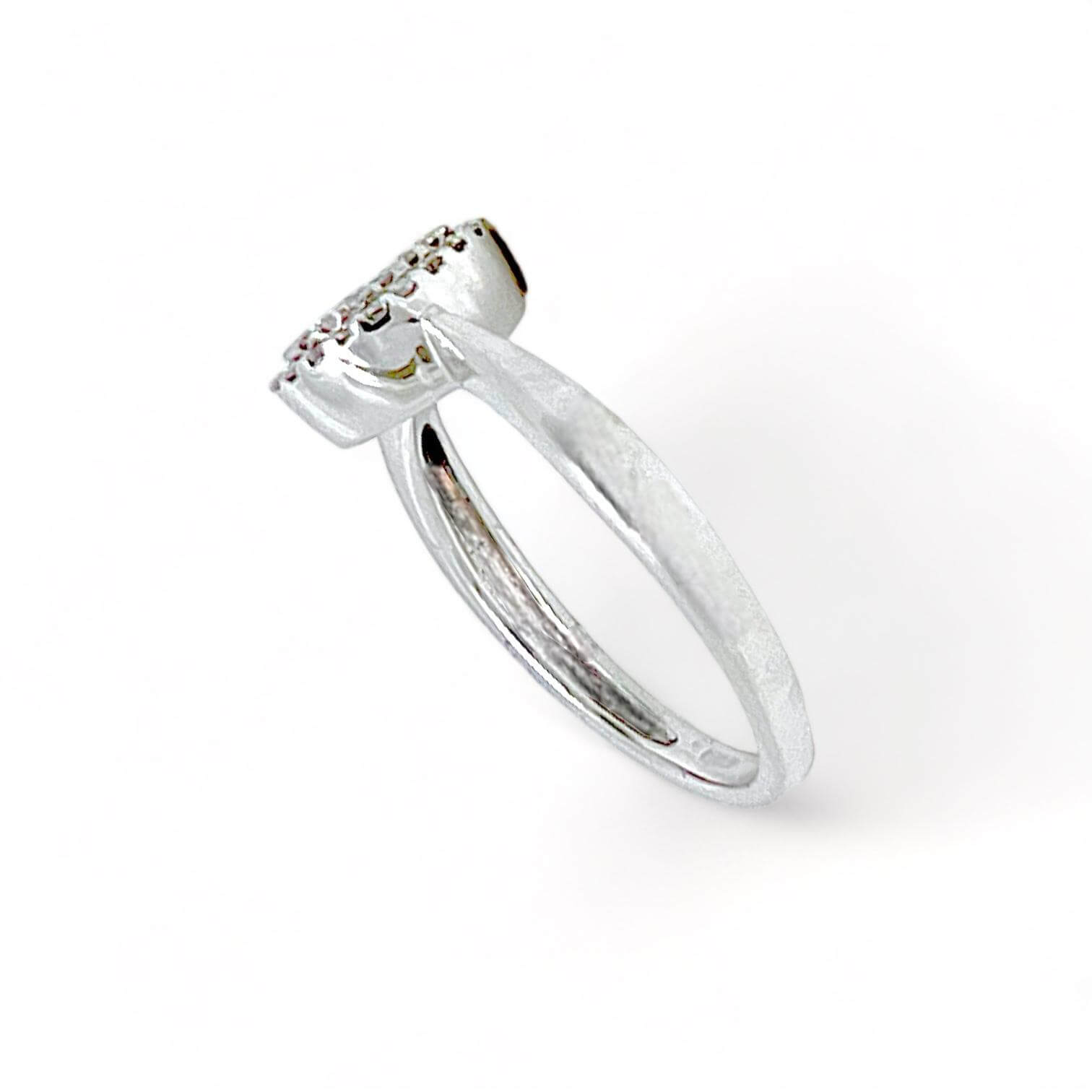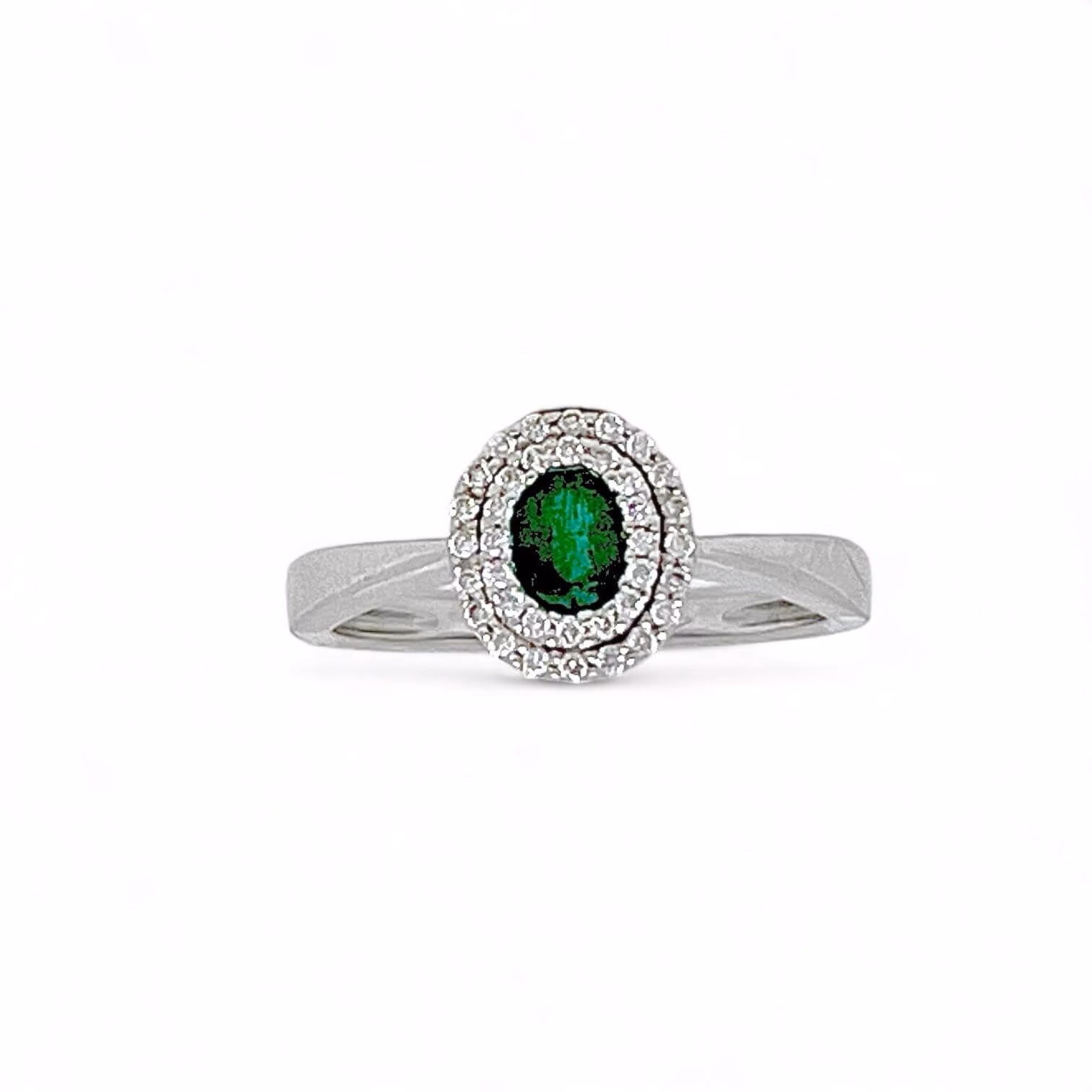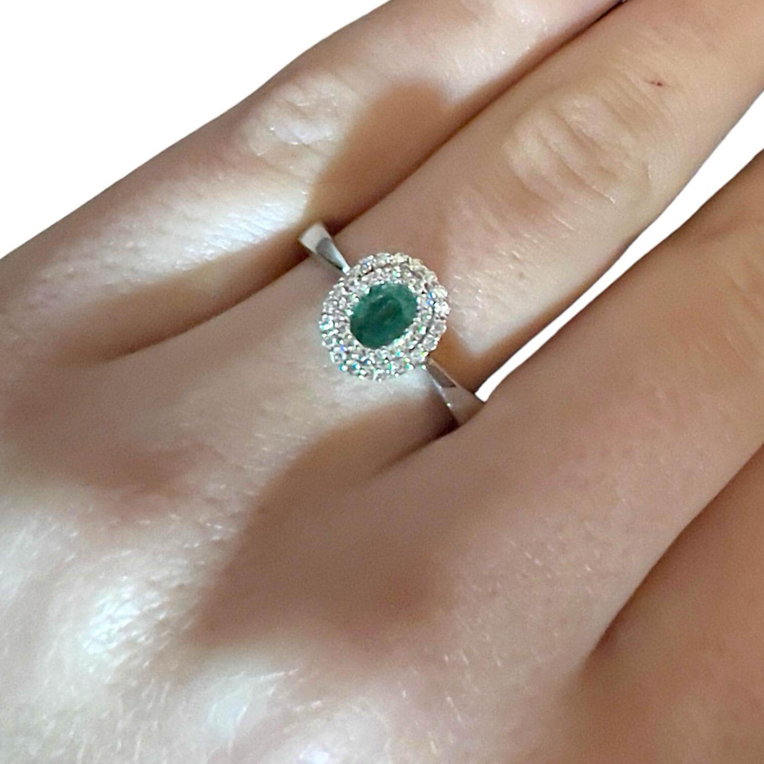 La montatura in oro bianco 750% 18 kt è una cornice elegante per lo smeraldo centrale da 0,35 Ct, con un taglio ovale che esalta la sua lucentezza naturale. L’attenzione ai dettagli e la lavorazione artigianale rendono questo anello un’autentica espressione di gioielleria di lusso.