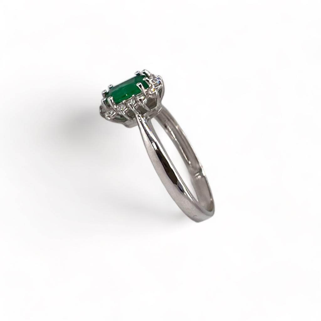 Anello smeraldo e diamanti Cipolla dal 1950 Gioiellieri, Lavorazione artigianale; Montatura in oro bianco 750% 18 kt Diamanti 0,35 ct colore F purezza VS1 smeraldo Colombia provenienza Colombia 0,97 ct