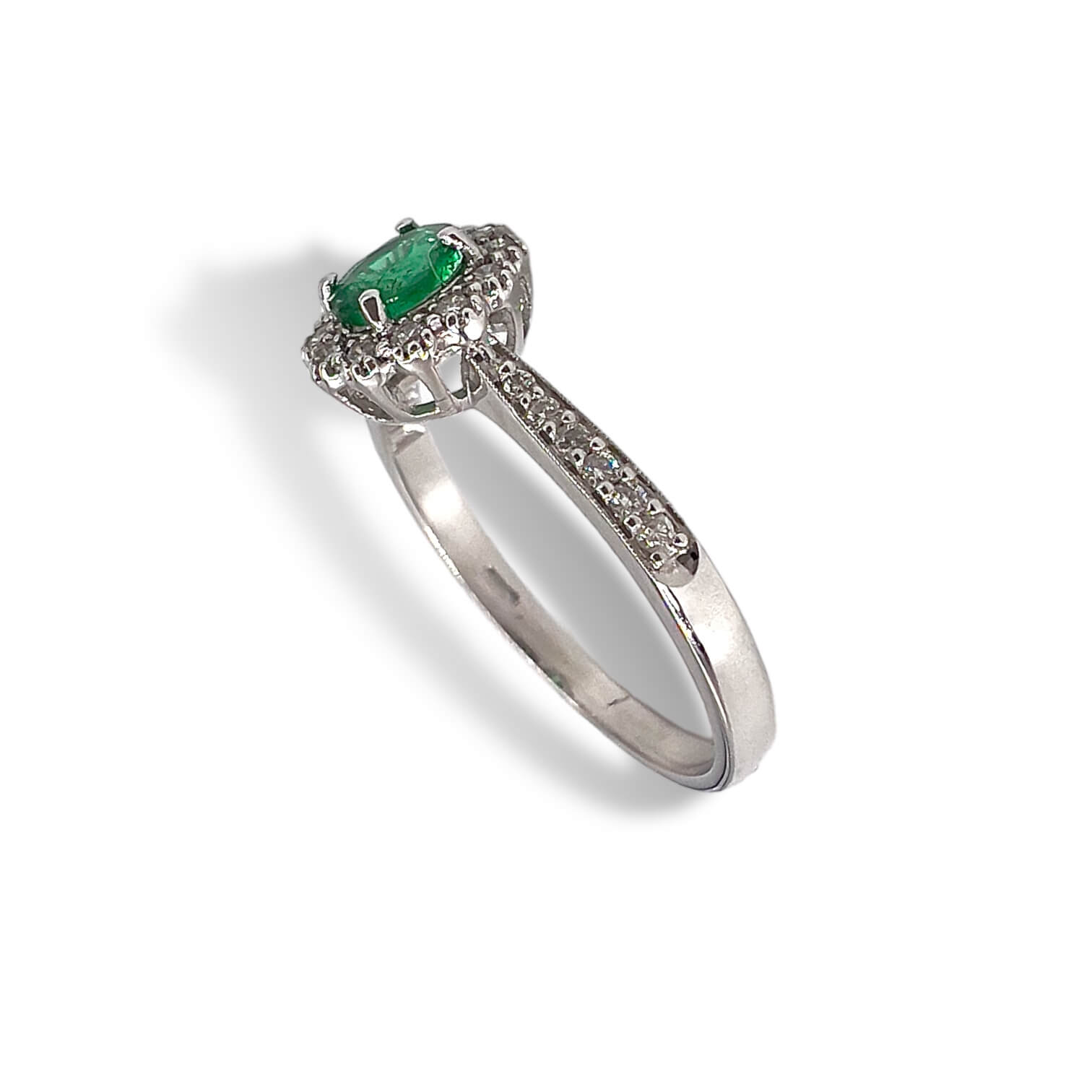 Anello con smeraldo e diamanti Cipolla dal 1950 Gioiellieri COLLEZIONE BELLE EPOQUE in oro bianco 750%, lavorazione artigianale Smeraldo peso 0,32 Diamanti peso 0,18 Ct colore F purezza VS1