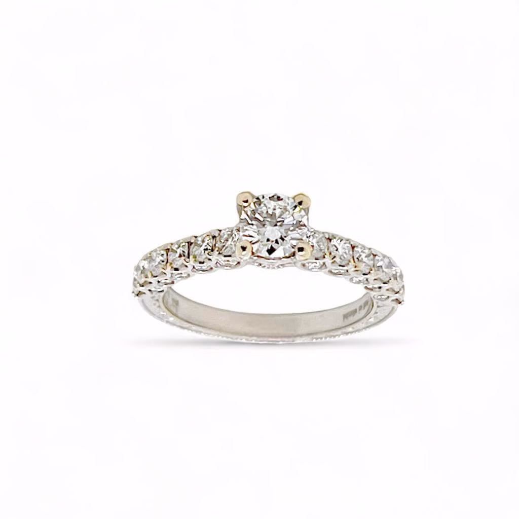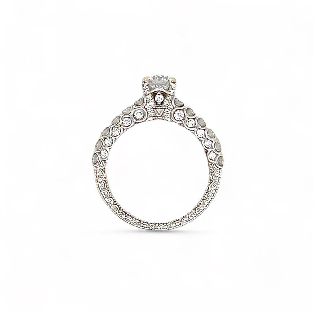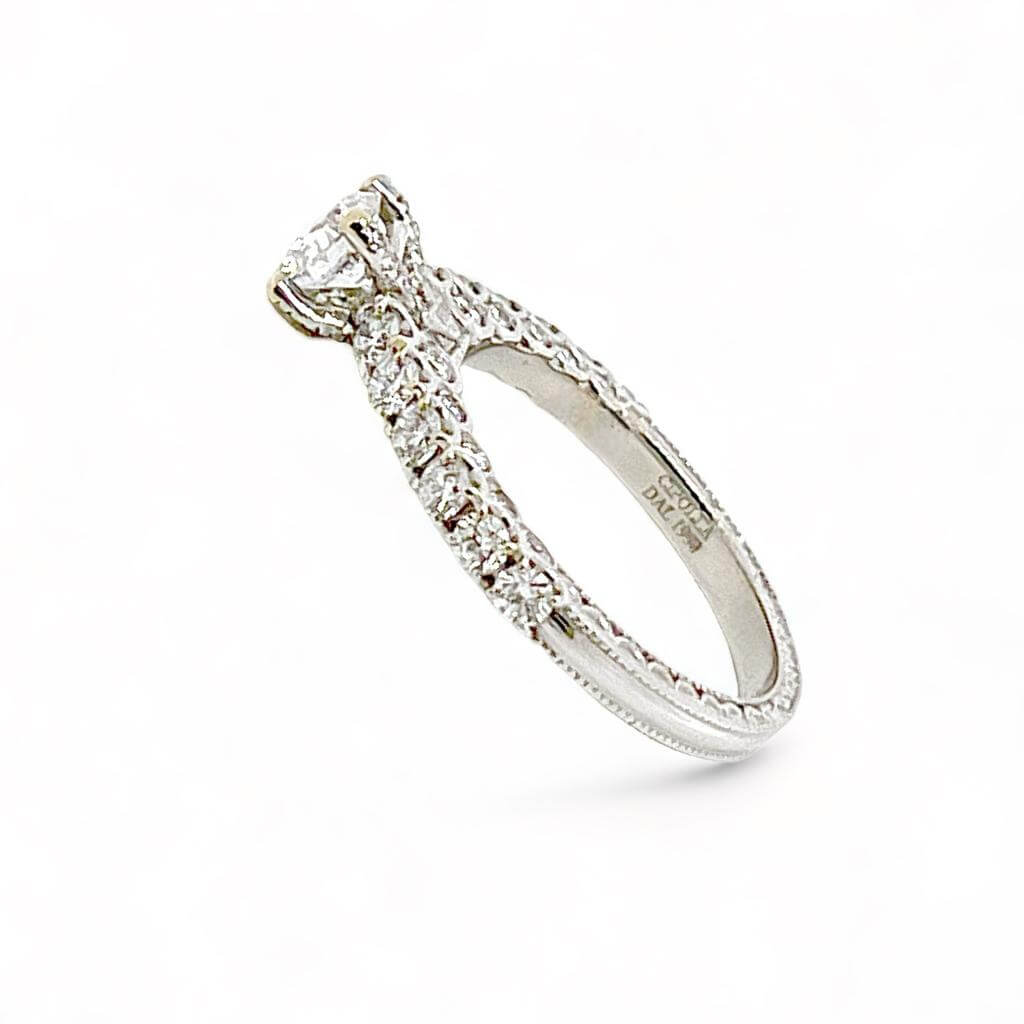 Anello solitario di diamanti Cipolla dal 1950 Gioielli lavorazione artigianale,montatura in oro bianco 750% Diamante centrale taglio round brilliant peso 0,50 ct colore D Purezza SI1 certificato GIA AMERICA n.7442614213 incisione a laser ,Diamanti a contorno taglio round brilliant peso 0,83 ct colore D purezza S1.