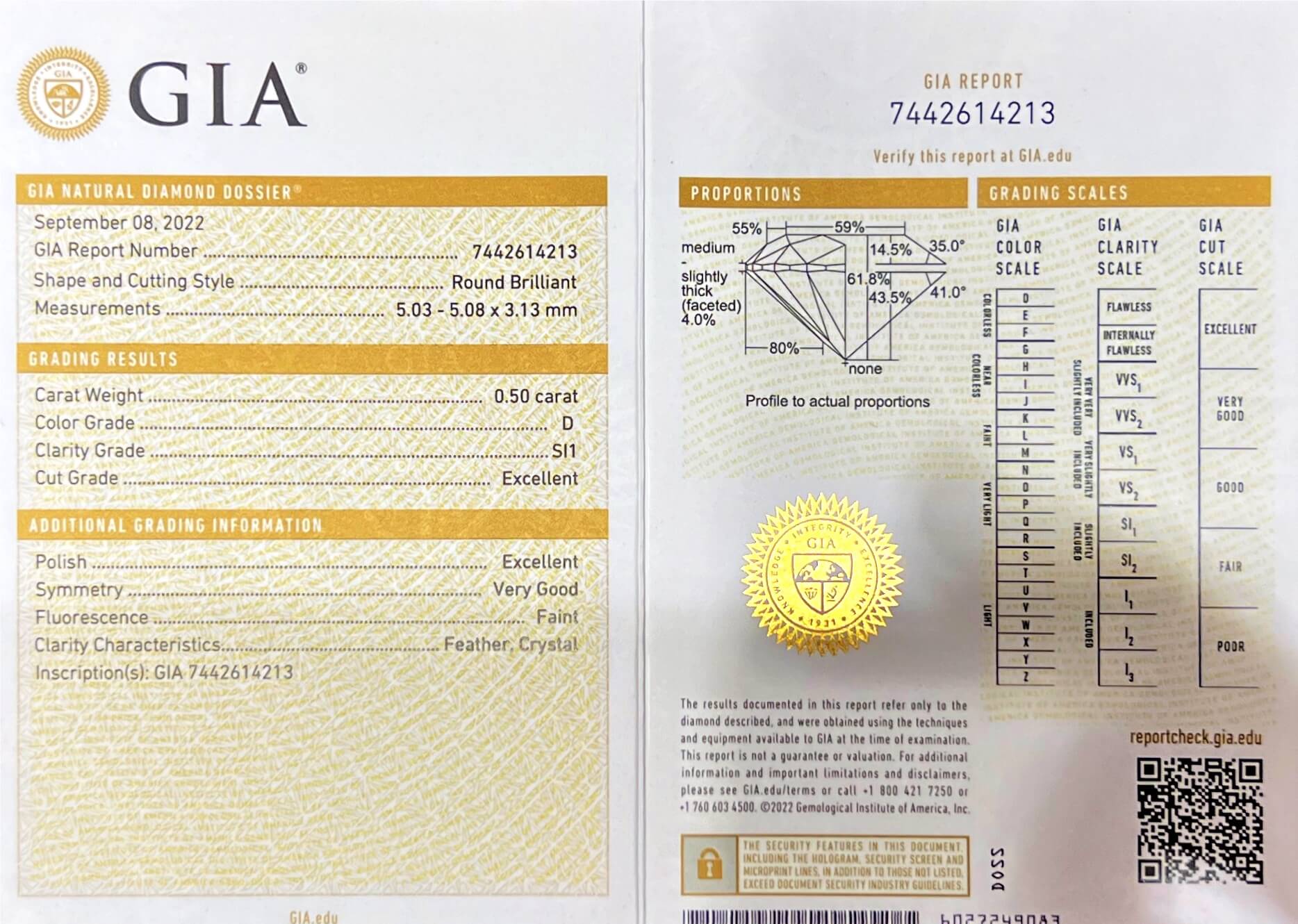 Anello solitario di diamanti in oro 750% Diamante centrale certificato GIA America peso 0,50 colore D purezza SI2, diamanti a contorno peso 0,83 colore D/ SI