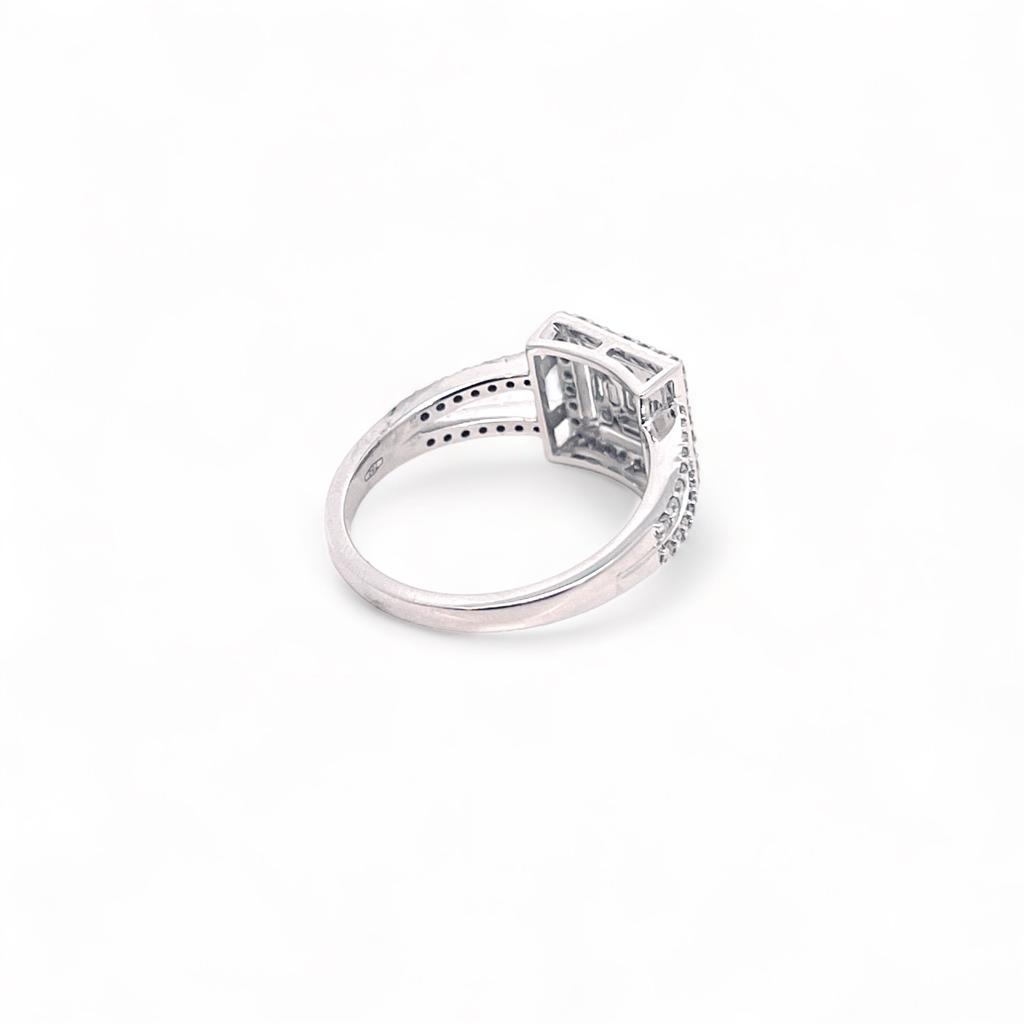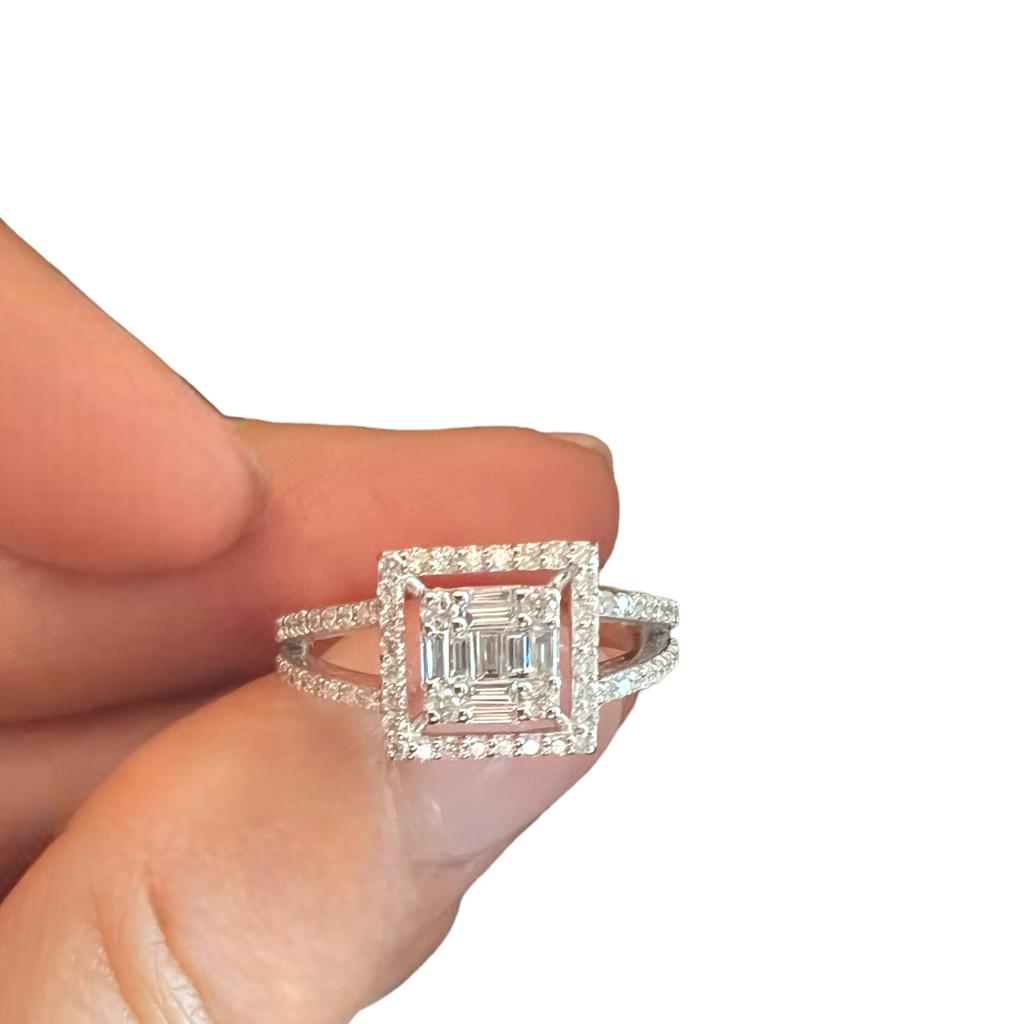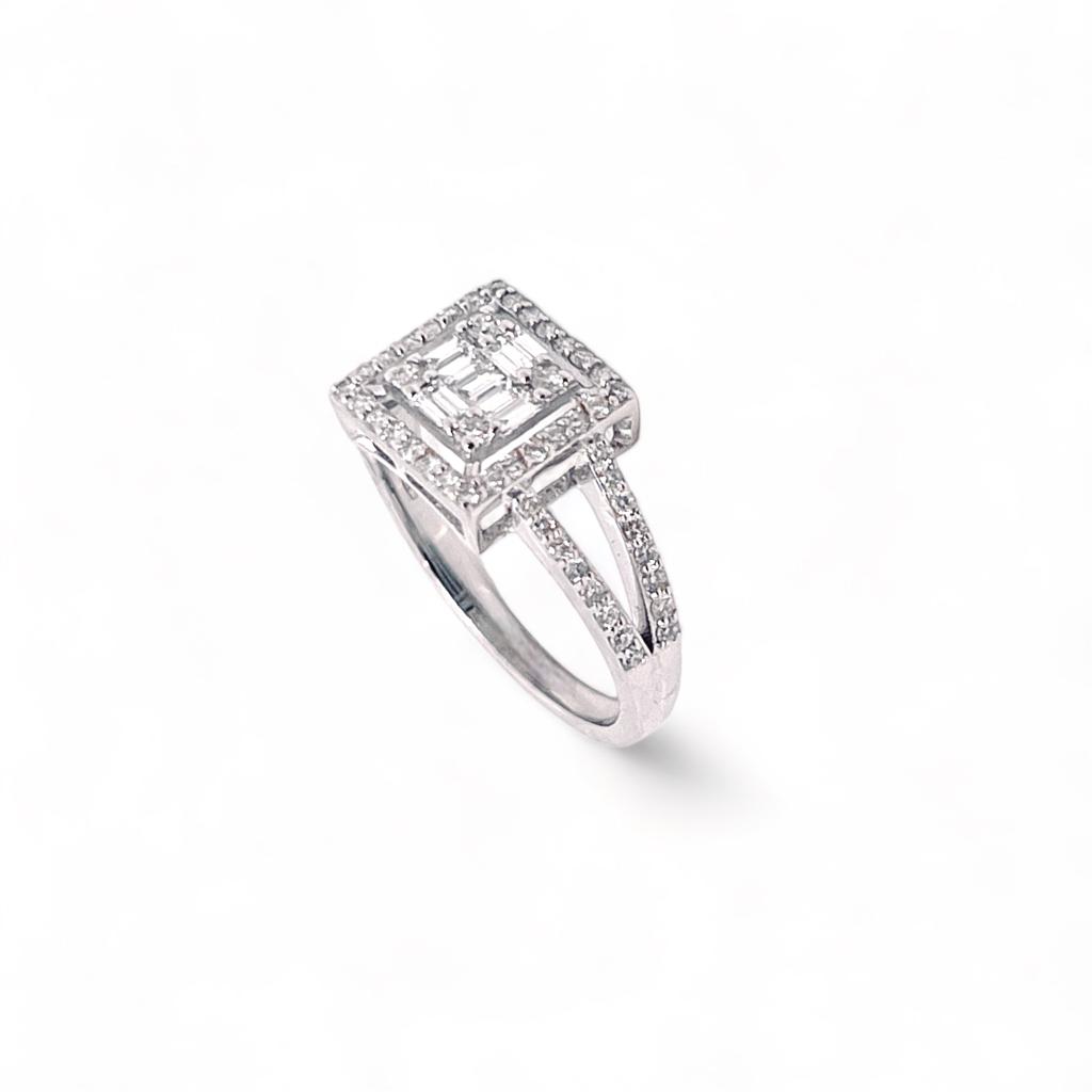 Anello solitario di diamanti Cipolla dal 1950 Gioiellieri, Lavorazione artigianale; Montatura in oro bianco 750% 18 kt Diamanti taglio brillante e taglio baguette, peso 0,72 ct colore F purezza VS1