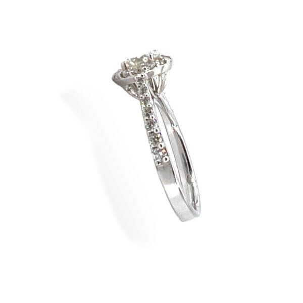 Anello solitario con diamanti in oro bianco 750% diamante centrale taglio round brilliant peso 0,93 Ct colore F purezza Vs1 diamanti di contorno peso 0,68 Ct colore F purezza VS1