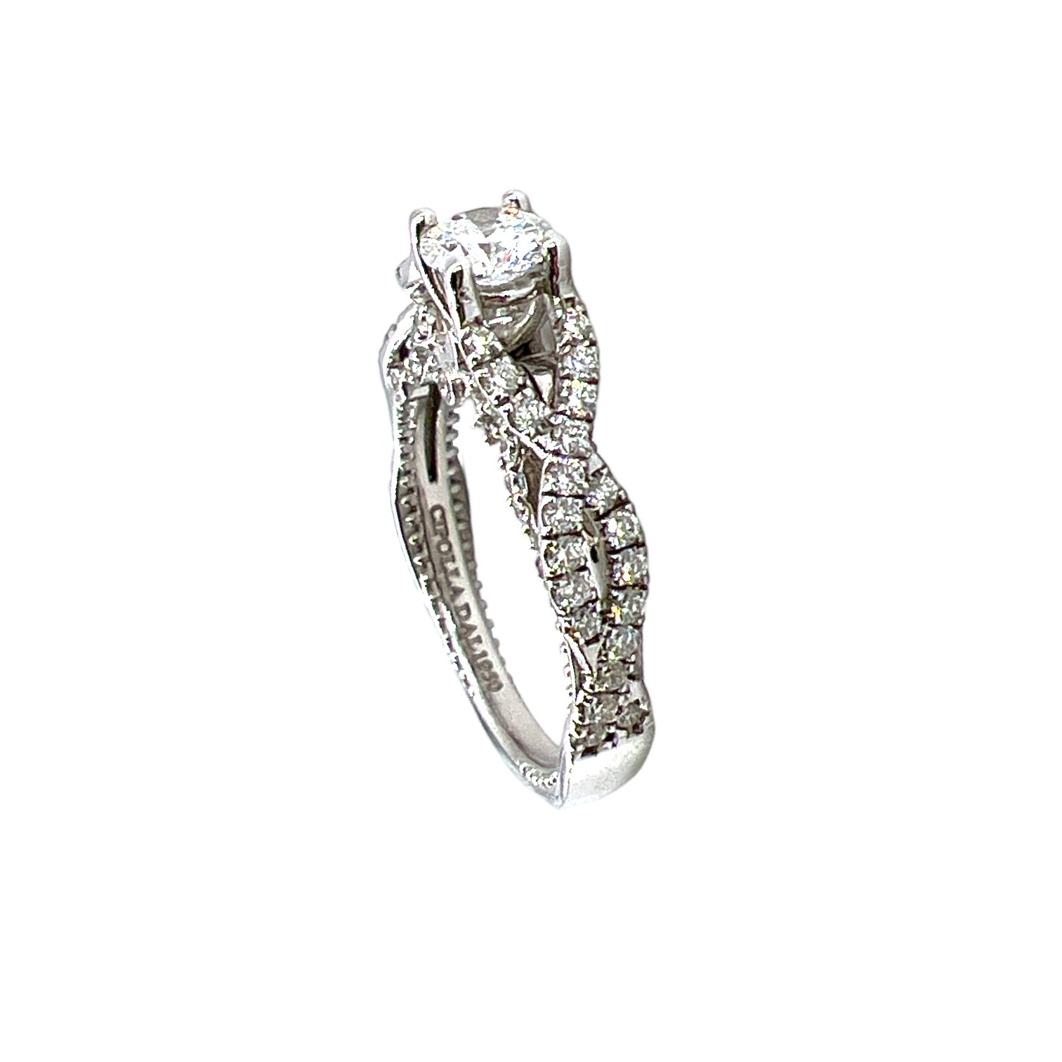 Anello solitario art. A412 in oro bianco 750‰ con diamante centrale da 0,50 ct e contorno di diamanti da 0,50 ct. Una creazione raffinata della collezione Barocco firmata Cipolla dal 1950 Gioiellieri, perfetta per chi ama l’eleganza senza tempo.