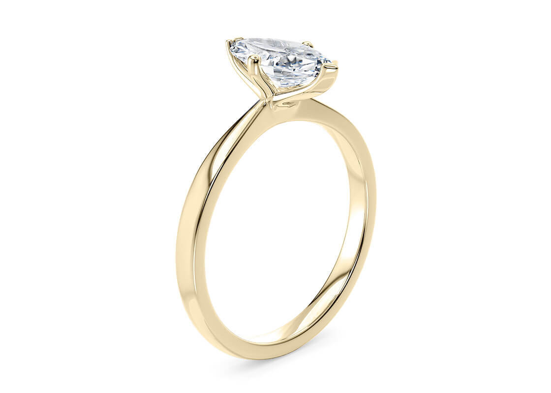 La pietra principale è un diamante marquise da 0,53 ct, colore D e purezza SI2, certificato GIA America inciso a laser. Il taglio marquise allunga le linee del gioiello, proiettando riflessi brillanti lungo la montatura e creando un gioco di luci che danza ad ogni movimento. La precisione del taglio marquise e la lucentezza impeccabile della montatura completano un profilo che si distingue per raffinatezza discreta.
