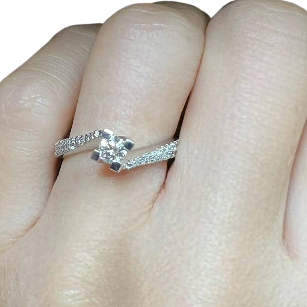 Anello solitario di diamanti a contrarié Cipolla dal 1950 Gioiellieri COLLEZIONE ABBRACCI, lavorazione artigianale; Montatura in oro bianco 750% 18 kt, Diamante centrale peso 0,31 ct taglio brillante colore F purezza VS2 diamanti su gambo 0,18 ct colore F purezza VS2.