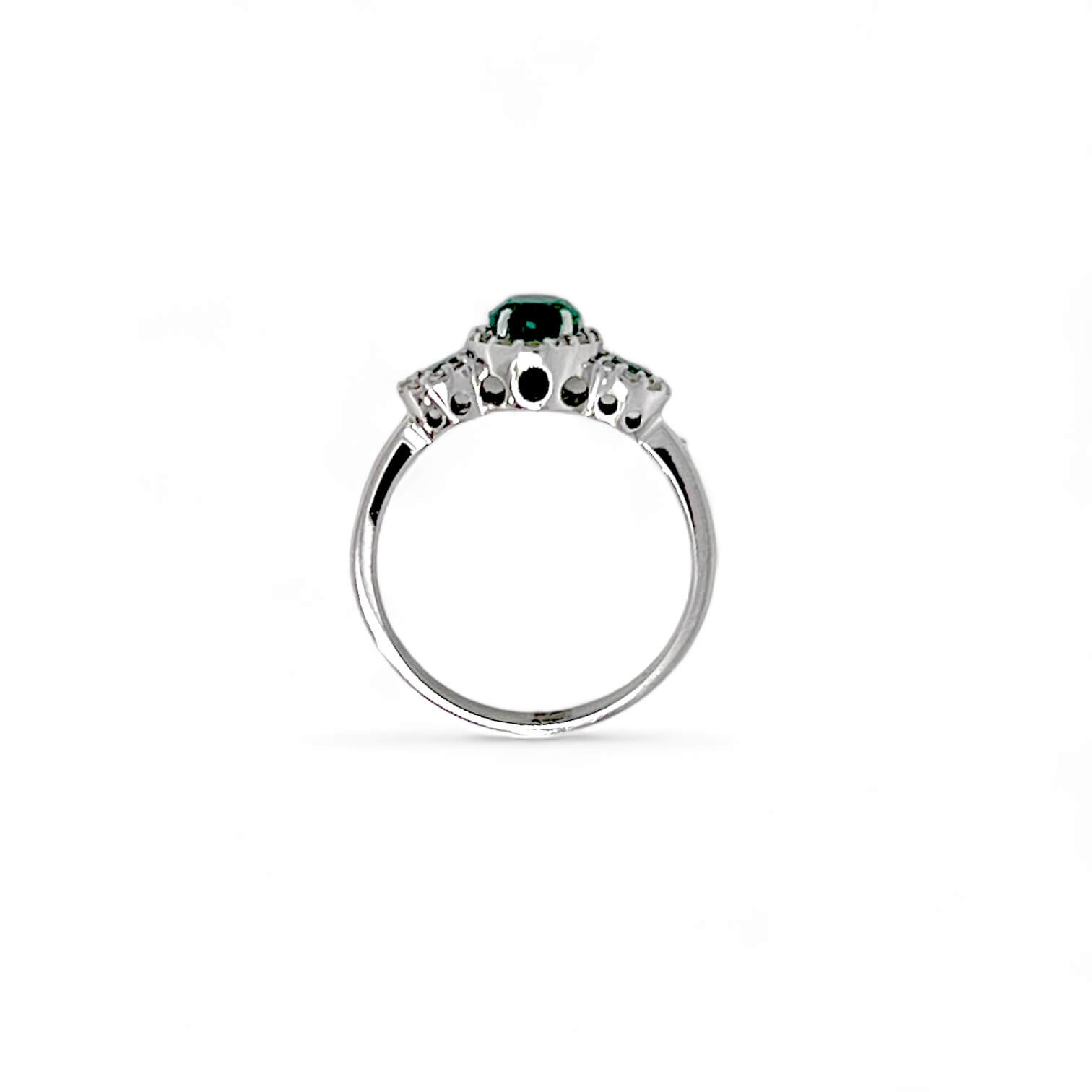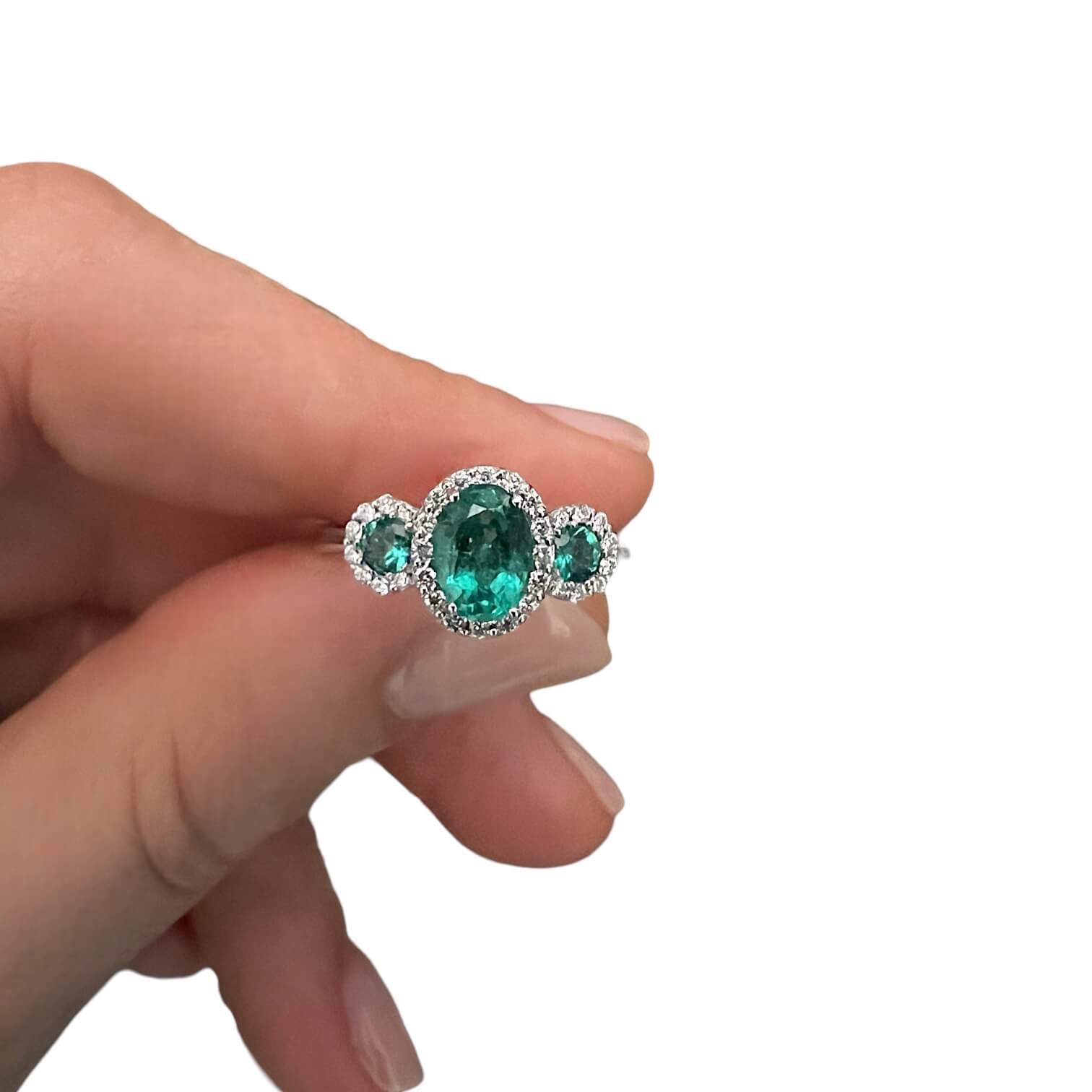 Anello Trilogy con smeraldi e diamanti Cipolla dal 1950 Gioiellieri COLLEZIONE BELLE EPOQUE, lavorarzione artigianale;Montatura in oro bianco 750% 18 kt diamanti 0,20 ct colore F purezza VS1 smeraldi 1,15 ct