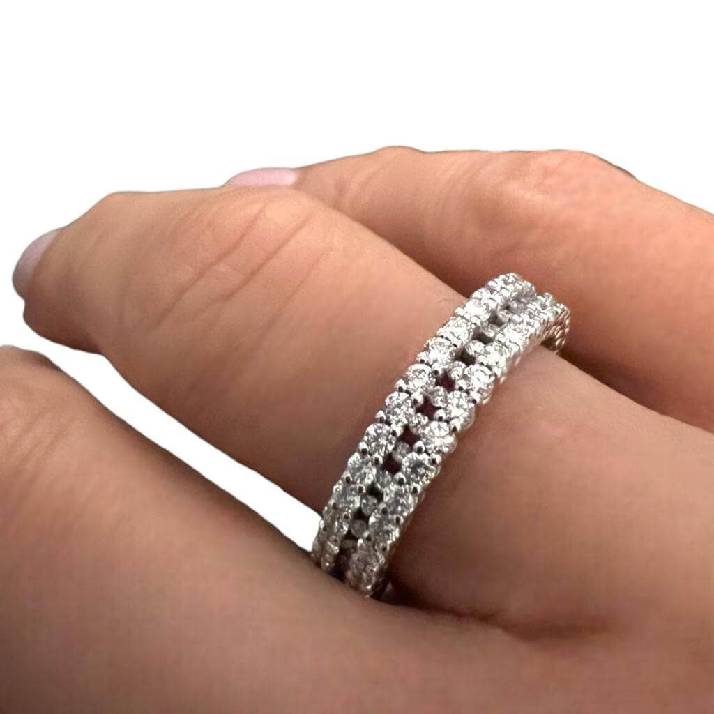 La montatura in oro bianco 750% conferisce al gioiello un’eleganza senza tempo, mentre i diamanti, con un peso complessivo di 1,18 ct, aggiungono uno splendore straordinario. Il taglio brillante delle pietre, il colore E e la purezza SI1, catturano la luce in ogni angolazione, creando un gioco luminoso che rende questo anello un vero e proprio capolavoro.