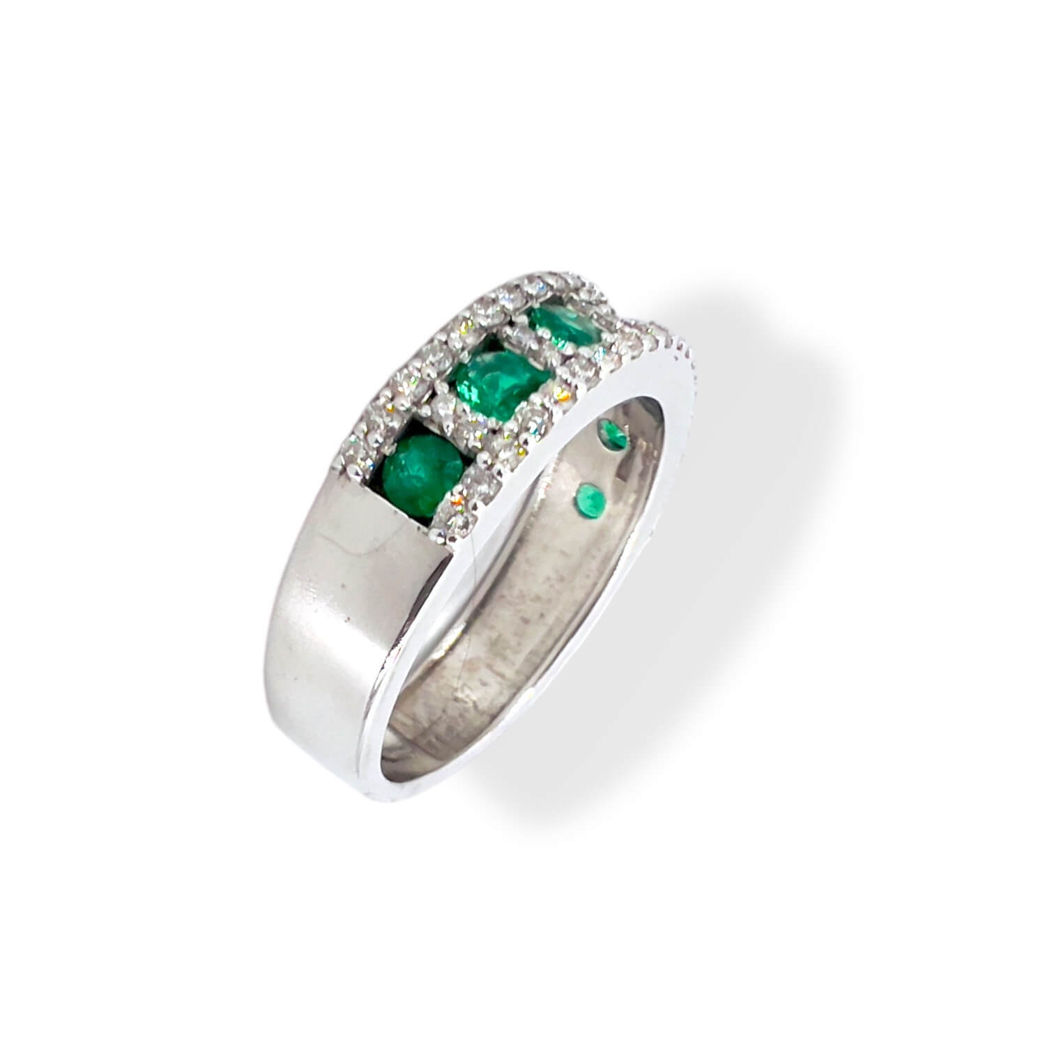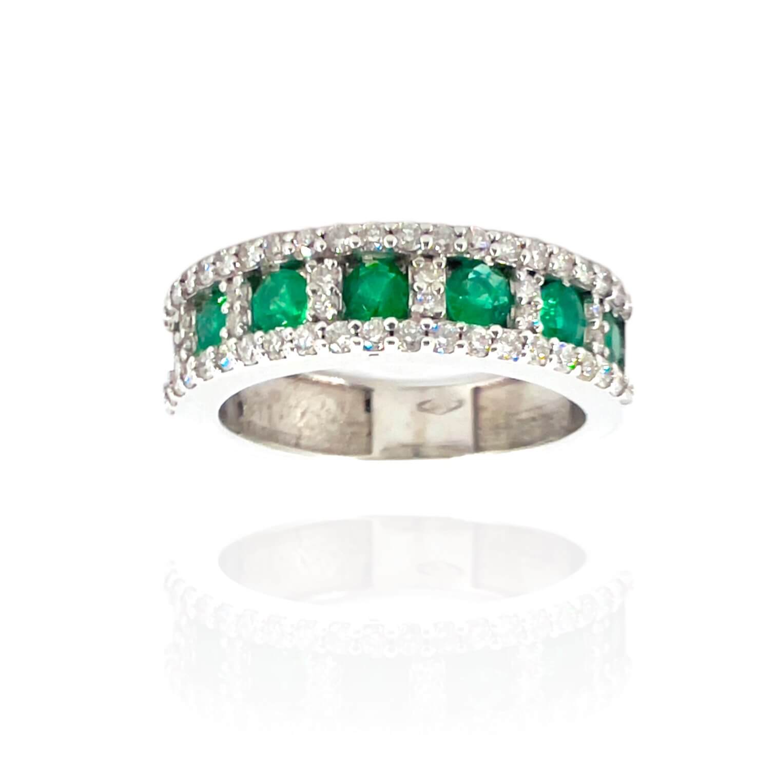 Anello veretta di smeraldi e diamanti in oro bianco 750% Smeraldi peso 0,53 Diamanti taglio round brilliant peso 0.45 Ct colore F purezza VS1