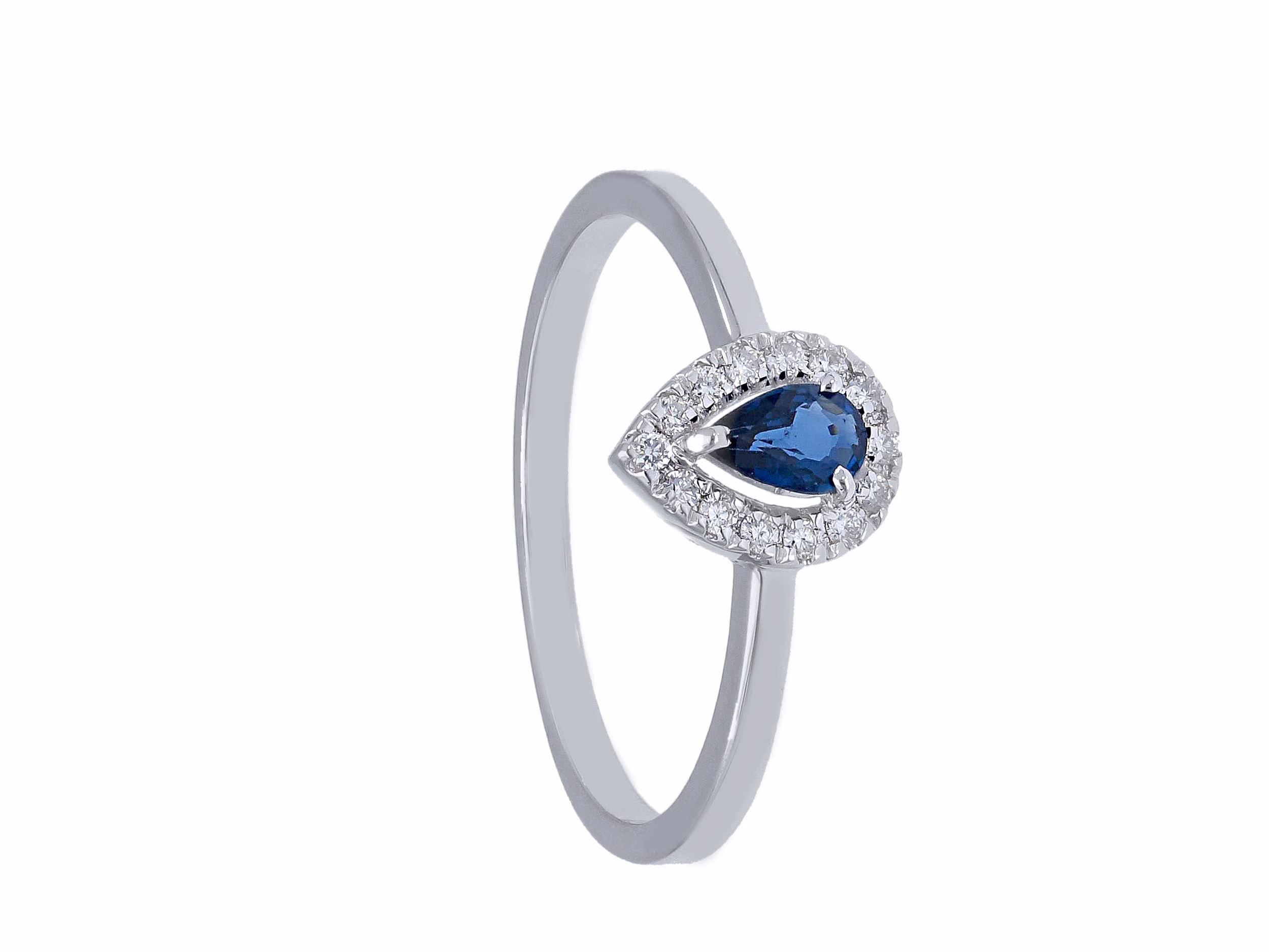 Anello in oro bianco 750% CIPOLLA DAL 1950 GIOIELLI COLLEZIONE BELLE EPOQUE, lavorazione artigianale, zaffiro blu taglio goccia ct 0,27 diamanti ct 0,09 taglio brillante colore f purezza VS2