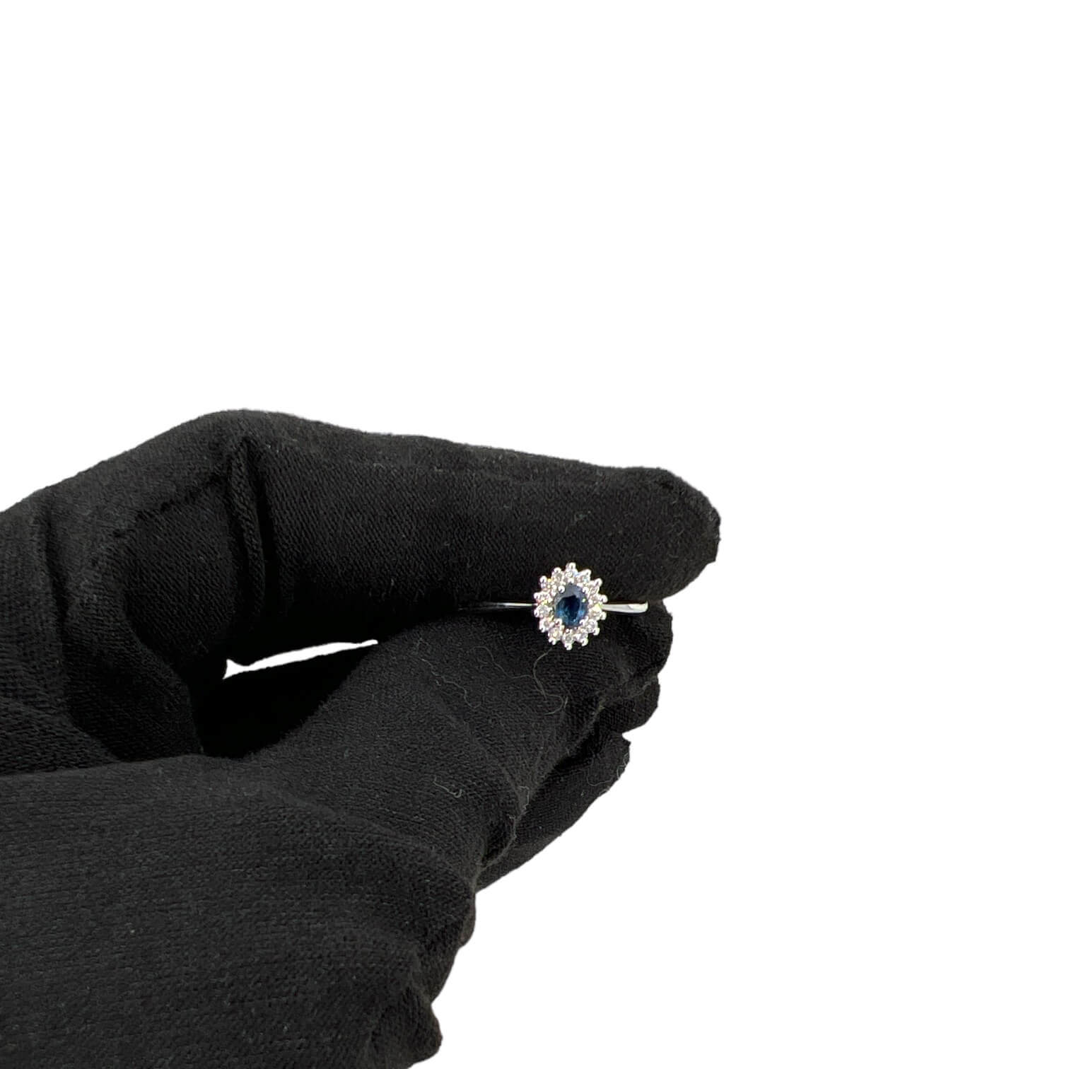 Anello con zaffiro e diamanti Cipolla dal 1950 Gioielli COLLEZIONE BON TON,Lavorazione artigianale; Montatura in oro bianco 750% 18 kt Zaffiro Taglio ovale peso 0,24 ct. Diamanti peso 0,12 ct, taglio brillante colore F purezza VS1