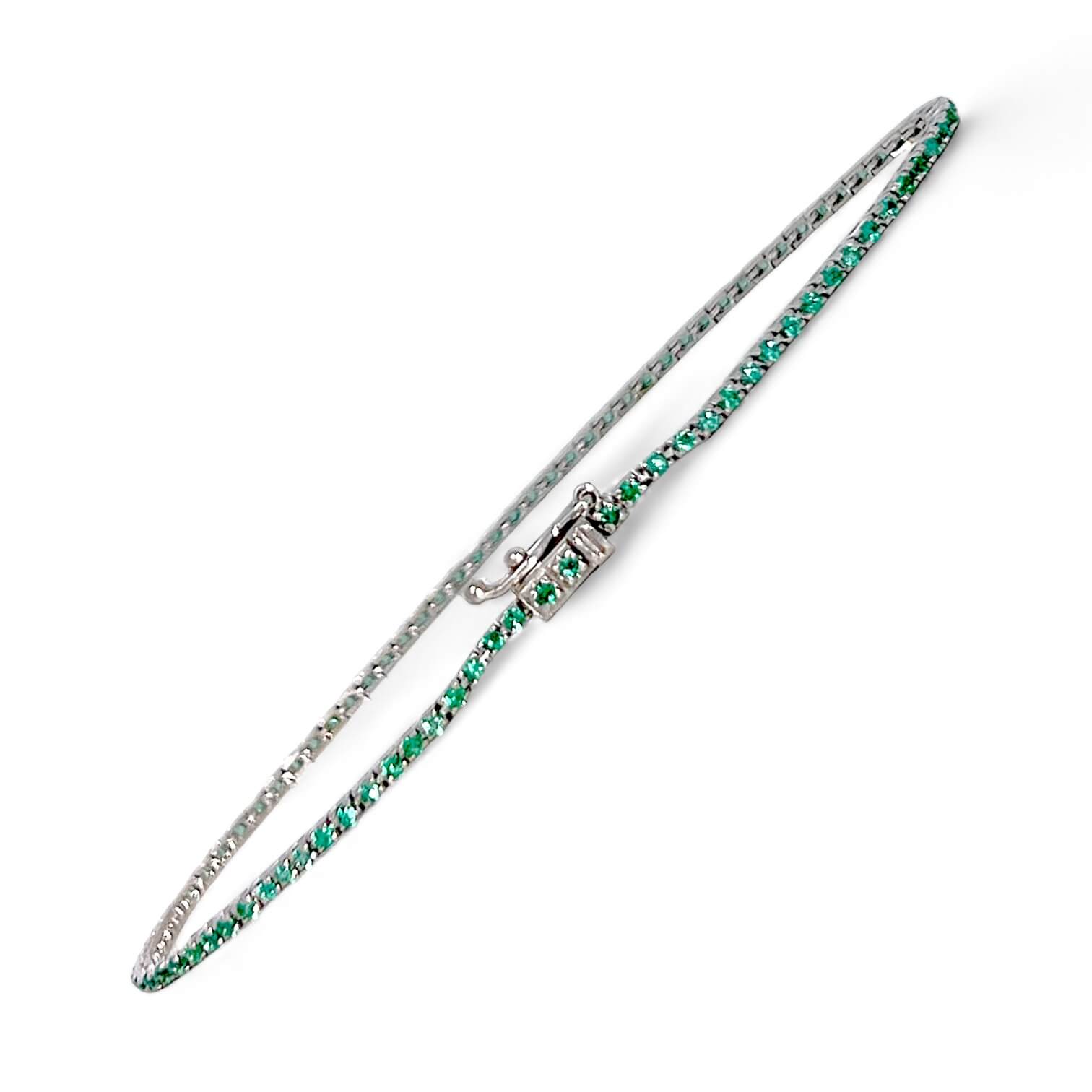 Scoprite l’eleganza senza tempo del bracciale tennis di smeraldi art. BR529. Realizzato in oro bianco 18 kt, questo pezzo raffinato è impreziosito da smeraldi provenienti dalla Colombia, per un totale di 0,70 carati.