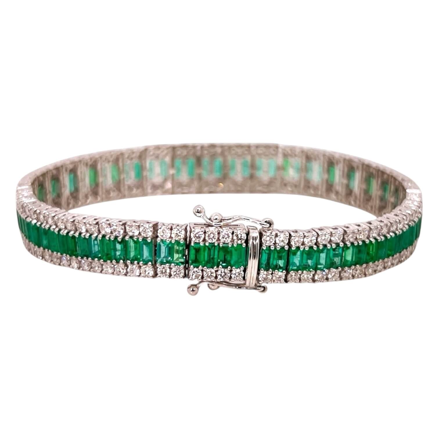 Bracciale tennis di smeraldi Cipolla dal 1950 gioielli collezione GEMME, Montatura a griffe piatte in oro bianco 18 carati 750% chiusura a baionetta con doppia sicura Smeraldi provenienza Colombia 10,50 Ct taglio smeraldo colore verde brillante, diamanti peso 5,00 ct colore F purezza VS1 taglio brillante