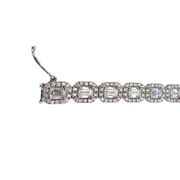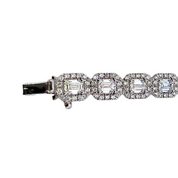 Bracciale Tennis in oro bianco 18kt, diamanti centrali peso 4,90 ct colore E purezza VS2 taglio Smeraldo, diamanti a contorno peso 1,75 ct colore E purezza VS2 taglio brillante. CIPOLLA DAL 1950 GIOIELLI art. 9131/10