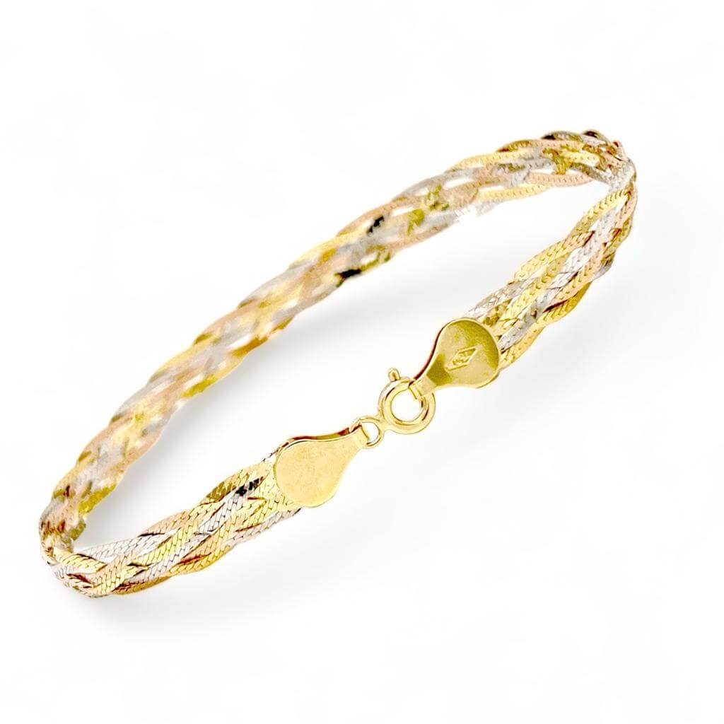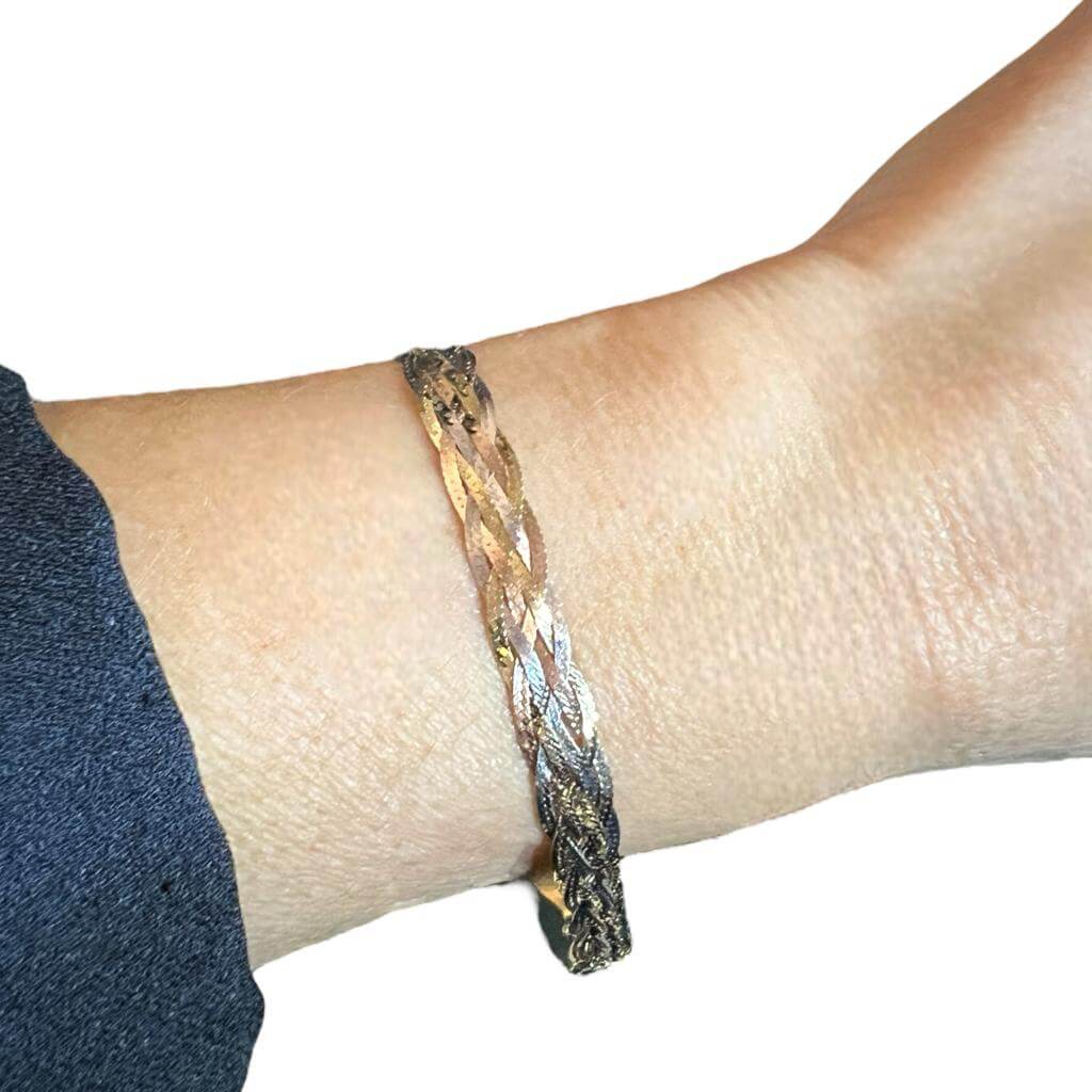 L’intreccio a mano di questo gioiello aggiunge un tocco di originalità e sofisticatezza, creando una trama unica che cattura lo sguardo. L’oro giallo, bianco e rosa si fondono armoniosamente, creando una sinfonia di colori che rende questo bracciale adatto a ogni occasione. Con un peso di 4,66 grammi, è leggero e comodo da indossare, offrendo un tocco di lusso senza sforzo.