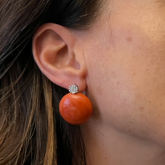 Orecchini di corallo a bottone in oro bianco 750% 18kt Cipolla dal 1950 gioielli lavorazione artigianale, corallo del mediterraneo diamanti ct 0,45 colore F purezza VS1