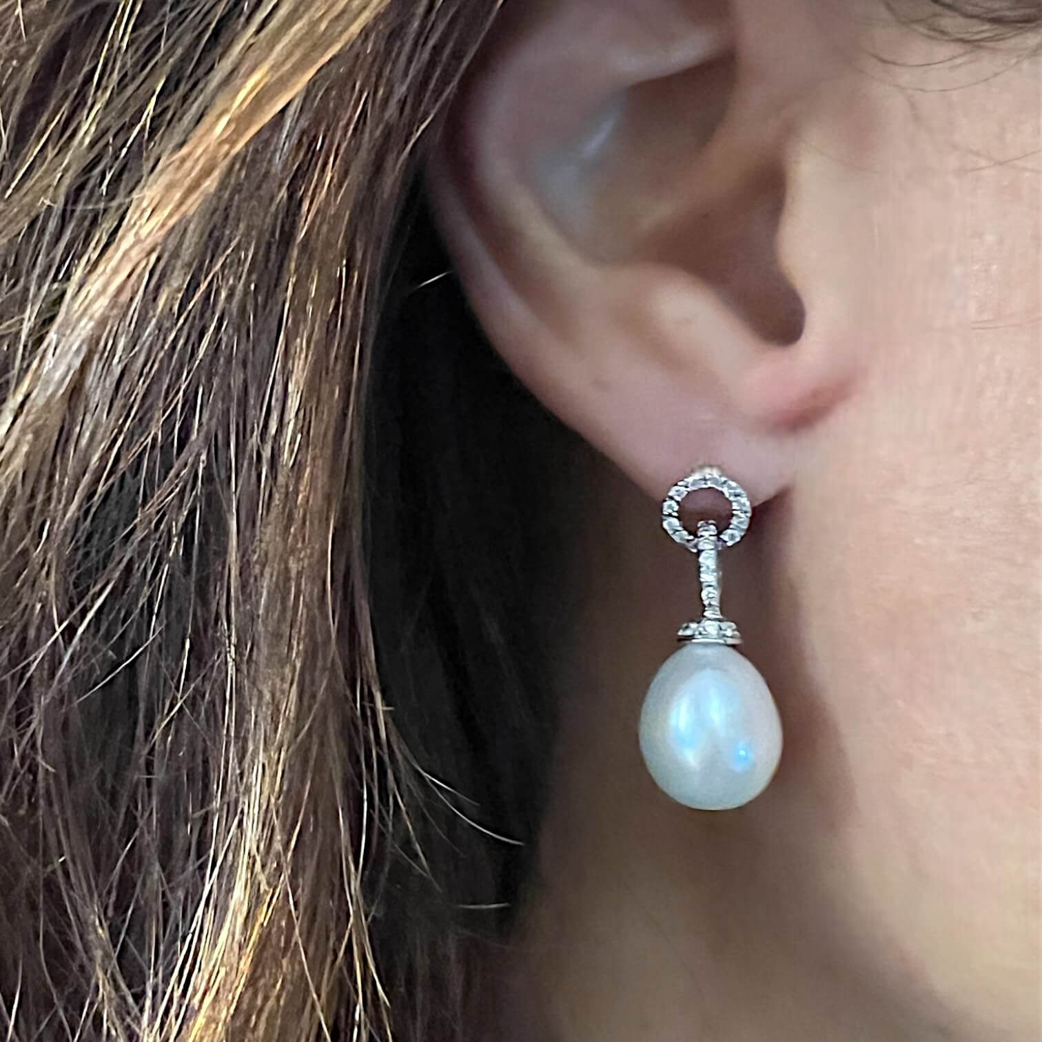 Orecchini con perle e diamanti in oro bianco 750% Diamanti peso 0,36 ct colore F purezza VS2 Perle a goccia 12X10,5 mm CIPOLLA DAL 1950 GIOIELLI ART. ORP238-2