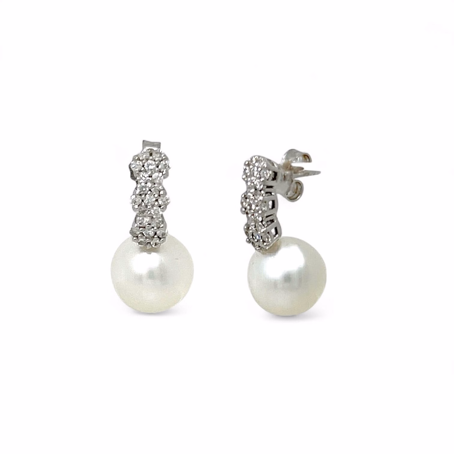 Orecchini con perle australiane e diamanti Cipolla dal 1950 Gioiellieri, lavorazione artigianale; Montatura in oro bianco 18 kt 750% Diamanti taglio brillante 0,37 ct colore F purezza VS1, Perle coltivate, provenienza Australia peso 12 KT