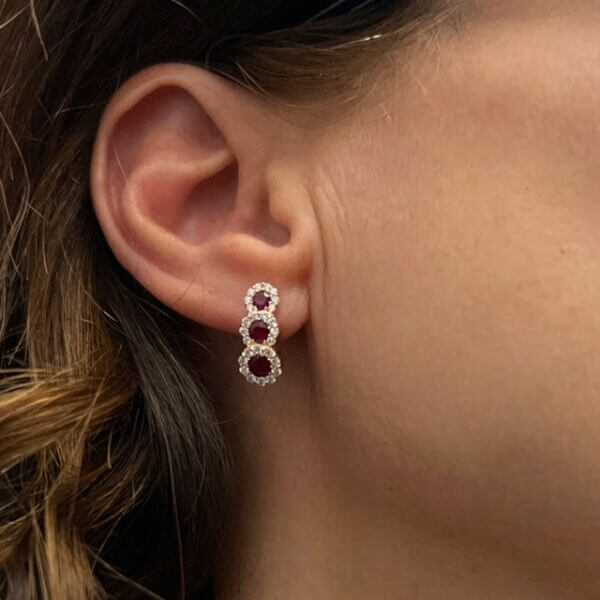 La montatura in oro rosa 750% è un’ode all’artigianato raffinato, creando un equilibrio armonioso tra forma e funzione. I diamanti da 0,49 ct, con un taglio brillante e una purezza VS1, illuminano con uno splendore etereo. I rubini rotondi da 0,73 ct, simbolo di passione e prosperità, completano il design con un tocco di colore vibrante.