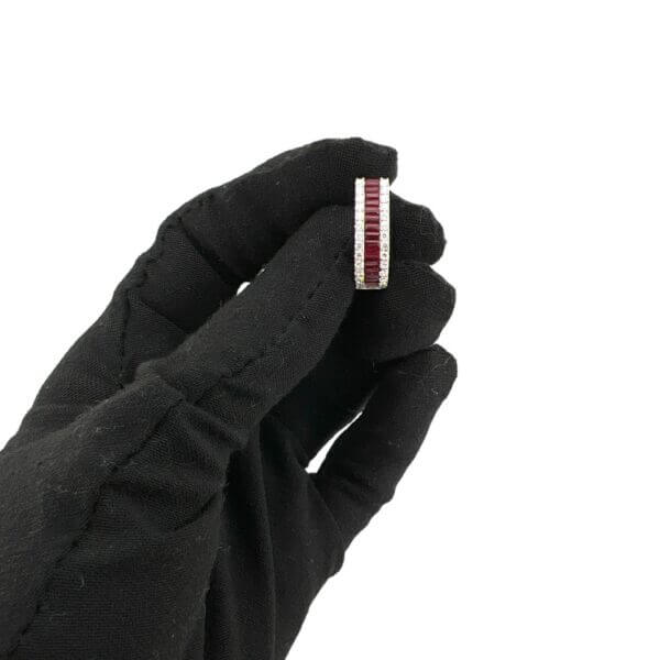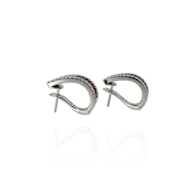 La montatura in oro bianco 750% avvolge con grazia due gioielli pregiati: rubini naturali tagliati rotondi da 1,94 ct, emblema di passione e raffinatezza. Intorno a questi tesori, diamanti brillanti da 0,73 ct, con colore F e purezza VS1, creano uno sfavillio di luce che cattura lo sguardo.